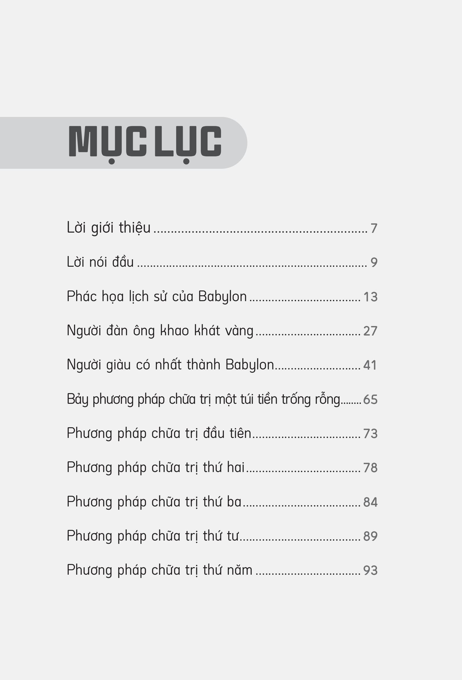 - Khổ sách: 13x19cm GIỚI THIỆU SẢN PHẨM Để thực hiện những tham vọng và khát khao của bản thân, bạn cần phải đạt được thành công về tiền bạc. Hãy sử dụng những nguyên tắc tài chính sẽ được giải thích rõ ràng trong những trang sách này. Hãy để chúng chỉ đường dẫn lối giúp bạn thoát khỏi những ràng buộc của một nguồn tài chính eo hẹp và vươn tới cuộc sống trọn vẹn hơn, hạnh phúc hơn nhờ có nguồn tài chính dồi dào. Cuốn sách Người Giàu Có Nhất Thành Babylon sẽ giúp bạn biết cách vận dụng những nguyên lý quan trọng để phát triển tài chính. Tác giả dẫn dắt bạn đi từ một hoàn cảnh khó khăn, tiêu biểu là một cái túi lép xẹp, đến một cuộc sống đầy đủ và hạnh phúc, tiêu biểu là một túi tiền căng phồng, sung túc. MỘT SỐ HÌNH ẢNH THAM KHẢO CAM KẾT