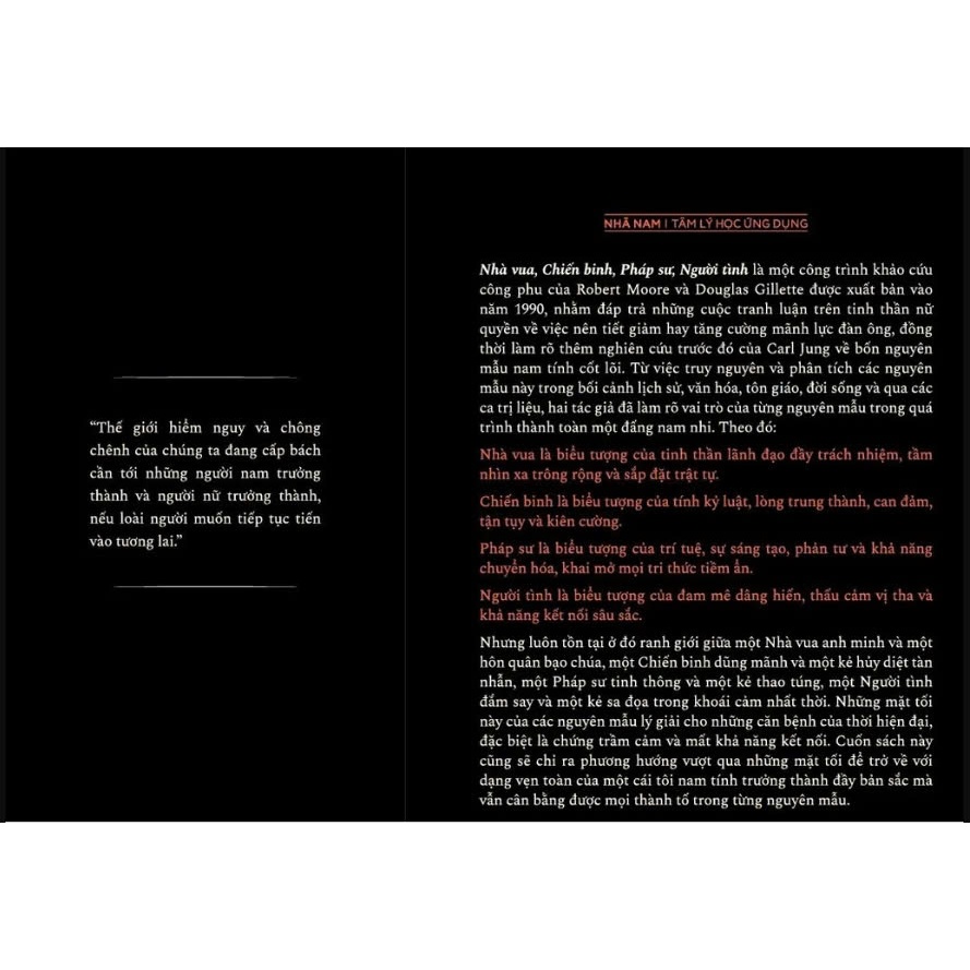 Nhà Vua, Chiến Binh, Pháp Sư, Người Tình của Robert Moore và Douglas Gillette, phát hành năm 2024 bởi Nhã Nam và NXB Thông Tấn, là một công trình khảo cứu nổi tiếng từ năm 1990, dựa trên lý thuyết của Carl Jung về bốn nguyên mẫu nam tính cốt lõi. Tác phẩm phân tích vai trò của từng nguyên mẫu trong hành trình trưởng thành của đàn ông, đồng thời chỉ ra mặt sáng và tối của chúng, từ đó đề xuất cách vượt qua những mặt tối để đạt đến một cái tôi nam tính trưởng thành, cân bằng và bản sắc.