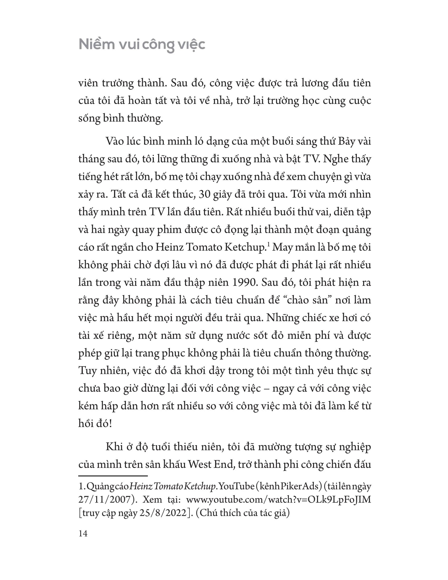 - Làm sao để sử dụng bộ công cụ này hiệu quả và phù hợp đối với bản thân? "Niềm vui công việc" được chia thành 4 phần, bao gồm: Phần 1: Giới thiệu về Niềm vui công việc và Nỗi buồn công việc Phần 2: Các yếu tố Niềm vui Công việc nội tại Phần 3: Các yếu tố Niềm vui Công việc bên ngoài Phần 4: Biến Niềm vui Công việc thành hiện thực Với bộ công cụ hữu ích này, bạn có thể sử dụng theo hai cách: Bạn có thể đọc nó từ đầu đến cuối, bắt đầu với những kiến thức nền tảng và từng bước tìm hiểu những lời khuyên thiết thực - một trải nghiệm đắm chìm trọn vẹn! Bạn cũng có thể tập trung vào các phần phù hợp với nhu cầu của m.ình ngay lúc này, từ đó áp dụng vào thực tế một cách dễ dàng hơn. Với "Niềm vui công việc" - một bộ sưu tập các công cụ thực tế, được thiết kế để đưa người đọc vào một chuyến thám hiểm nhằm tìm kiếm và duy trì nhiều niềm vui hơn trong đời sống công việc của chính m.ình, bạn chắc chắn sẽ tìm thấy lại được chính m.ình, tạm biệt tình trạng "zombie" công sở, thắp lại ngọn lửa say mê và giúp cho tinh thần phấn chấn, năng động trở lại!