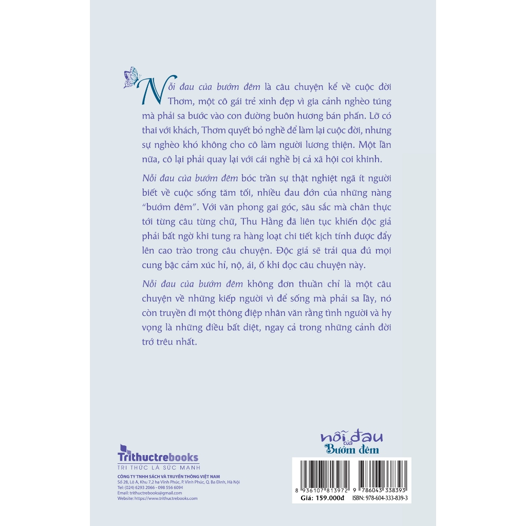 Nỗi Đau Của Bướm Đêm Khi còn nhỏ, Thu Hằng sống gần nhà của rất nhiều “cô bướm đêm”, cô đã quan sát, ghi nhớ về cuộc sống của họ. Sau này làm báo, cô lại được tiếp xúc với một số cô gái làm cái nghề đặc biệt ấy. Mặc dù không cổ súy, nhưng cô nhận ra nghề nào cũng có người này người kia. Cô đặt bút viết Nỗi đau của bướm đêm với hy vọng những trang viết của mình sẽ giúp những góc khuất được phơi bày, và để người đời có thể nhìn vào những cảnh đời đó bằng một ánh mắt khoan dung hơn. Bởi cuộc sống ngắn ngủi, nhìn đời một cách khoan dung, nhân hậu là cách duy nhất để tâm được nhẹ nhàng. Nỗi đau của bướm đêm là câu chuyện kể về cuộc đời Thơm, một cô gái trẻ xinh đẹp vì gia cảnh nghèo túng mà phải sa bước vào con đường buôn hương bán phấn. Lỡ có thai với khách, Thơm quyết bỏ nghề để làm lại cuộc đời, nhưng sự nghèo khó không