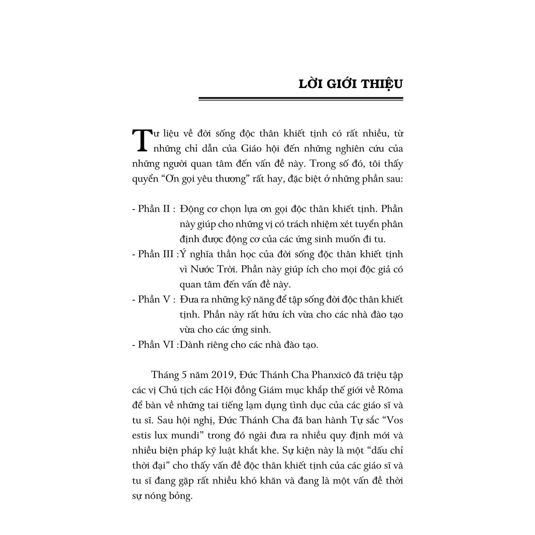 Có thể nói đây là lần đầu tiên tôi được đọc một quyển sách về ý nghĩa của đời sống độc thân khiết tịnh hay như thế này. Với lời văn mạch lạc, rõ ràng, dễ hiểu, nhiều ví dụ thực tế, càng đọc tôi càng cảm thấy thấm thía. Đây là một tập sách rất hữu ích và cần thiết cho các tu sinh, chủng sinh, tu sĩ, linh mục, và những ai muốn bước theo Chúa Kitô trong “Ơn gọi yêu thương.” Đặc biệt, tập sách này khổng thể thiếu đối với các nhà đào tạo, những người có trách nhiệm huấn luyện ơn gọi trong môi trường học viện và Đại chủng viện. Đọc xong tập sách này, tôi càng yêu mến đời tu hơn, vì tôi khám phá ra nhiều ý nghĩa và giá trị của ơn gọi mà tôi đã và đang theo đuổi. Hy vọng nhiều người sẽ tìm thấy sự hữu ích của quyển sách này.