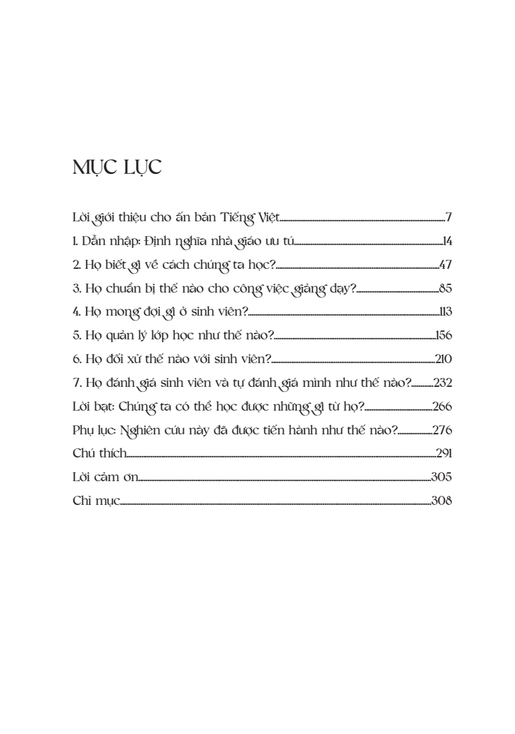 Cuốn sách gồm 7 chương và phần lời bạt, cung cấp cho chúng ta những kiến thức chi tiết và đa chiều về phương pháp giảng dạy của những nhà giáo xuất chúng nhất trong lĩnh vực giáo dục đại học tại Hoa Kỳ. Khi viết cuốn sách này, tác giả cùng các cộng sự đã phỏng vấn, dự khán, phân tích tài liệu giảng dạy cũng như khảo sát sinh viên, đồng nghiệp của 63 nhà giáo thuộc 40 lĩnh vực khác nhau trên toàn nước Mỹ, từ toán học, khoa học tự nhiên cho tới kịch nghệ, lịch sử. Thông qua những cuộc phỏng vấn này, tác giả đã đưa ra kết luận về những phẩm chất của các nhà giáo ưu tú, dựa trên 6 câu hỏi cơ bản:
