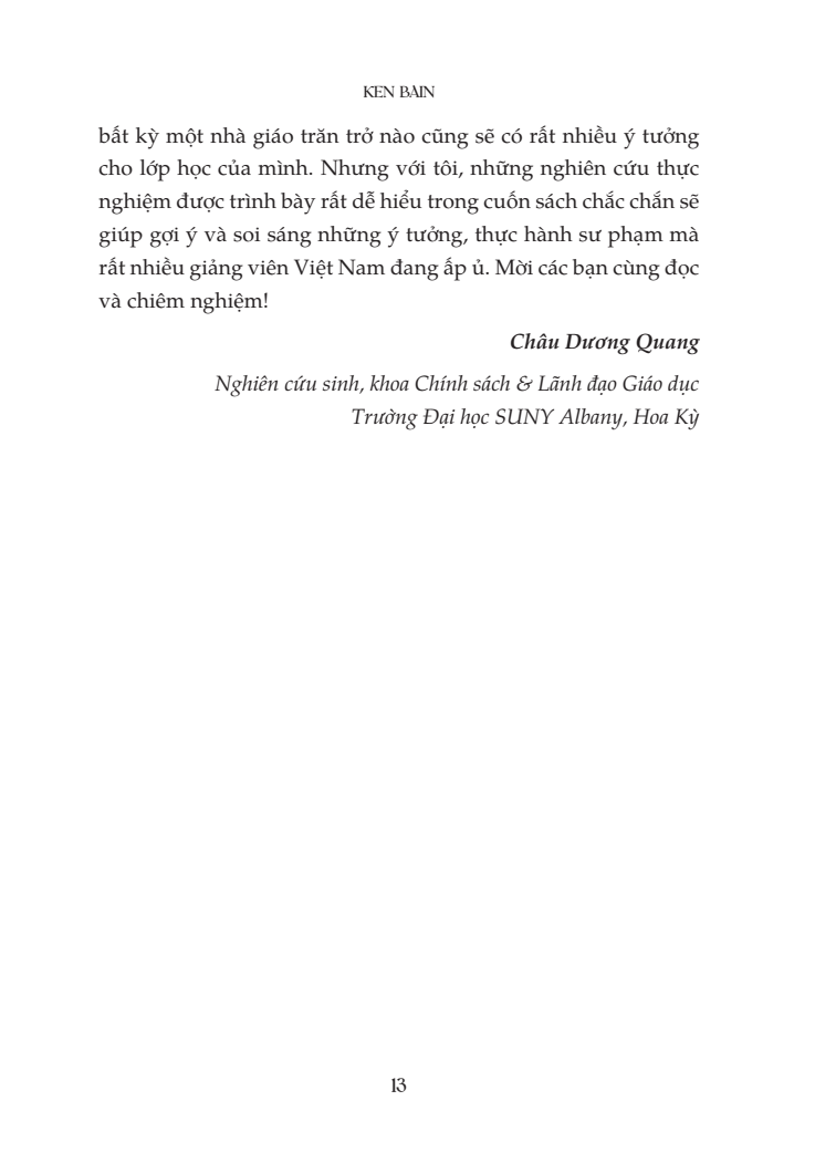 Ken Bain hiện là viện trưởng của Học viện Nhà giáo Ưu tú (Best Teachers Institute), một tổ chức nghiên cứu và giáo dục có trụ sở tại New Jersey và Washington, D.C. Ông từng là hiệu phó thường trực và hiệu phó phụ trách khối nghiên cứu tại Viện Đại học District of Columbia, cũng như thành lập các trung tâm giảng dạy tại bốn trường đại học lớn (Vanderbilt, Northwestern, NYU và Montclair State). Ken cũng là một nhà sử học với các tác phẩm chủ yếu tập trung vào lịch sử chính trị Hoa Kỳ giữa thế kỷ XX, ví dụ như The March to Zion và Last Journey Home: Killing Roosevelt. Ông đã dành nhiều thời gian để nghiên cứu về các vấn đề thuộc lĩnh vực sư phạm và đã đóng góp vào học bổng nghiên cứu trong những lĩnh vực đó. Ông đã được mời thuyết trình tại gần 500 trường đại học và sự kiện ở Hoa Kỳ, Canada, Mexico, Nam Mỹ, châu Âu, châu Á, châu Phi và Úc. Các nghiên cứu của ông tập trung vào nhiều vấn đề, bao gồm việc học sâu cũng như tạo ra môi trường học tập đề cao tư duy phản biện và diễn ra tự nhiên. Ông thường xuyên tham gia cố vấn cho các trường đại học, chính phủ và Liên minh Châu Âu.