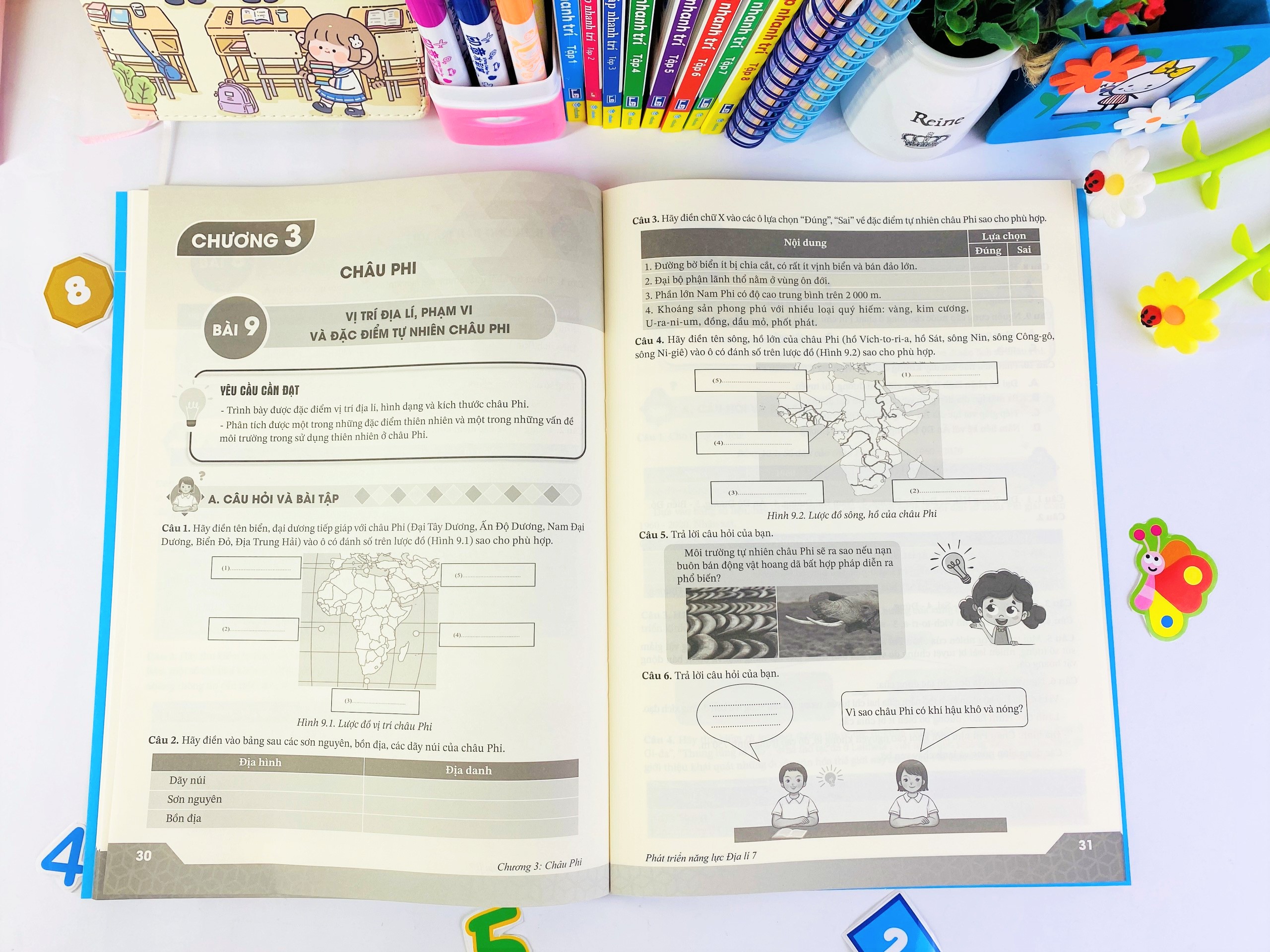 Trong mỗi bài, các em sẽ gặp các dạng câu hỏi và bài tập: tự luận, làm việc với hình (sơ đồ, lược đồ, bản đồ, biểu đồ, tranh ảnh, bảng số liệu...); ghép nối (nối các ô với nhau); diễn nội dung (điền vào câu thiếu hoặc cột trống của bảng, ô trống của sơ đồ); câu hỏi trắc nghiệm... Các dạng câu hỏi khác nhau giúp các em rèn luyện và phát triển các năng lực đị.a lí khác nhau: Nhận thức đị.a lí, tin hiểu địa lí, vận dụng kiến thức, kĩ năng đã học vào thực tiễn.
