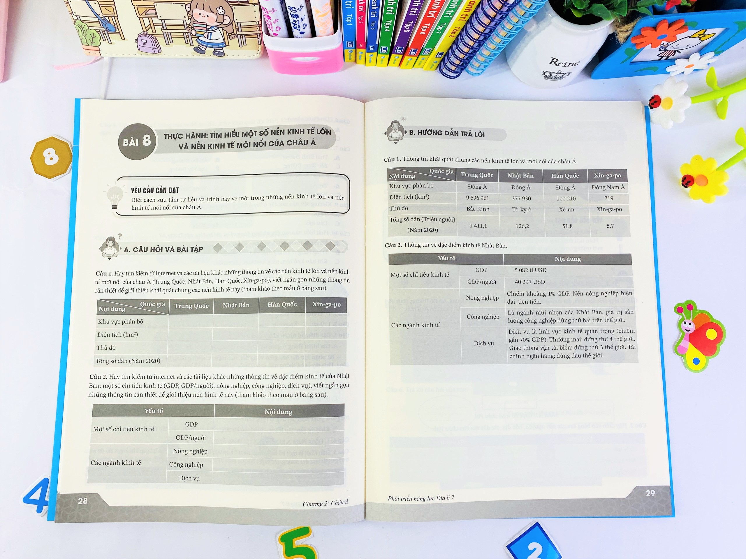 Sau phần câu hỏi, bài tập có phần hướng dẫn trả lời giúp các em định hướng đúng cách trả là câu hỏi và bài tập. Sau mỗi bài học trên lớp, các em thực hiện các câu hỏi, bài tập theo sách sẽ giúp phát triển năm lực tự học, tự nghiên cứu và các phẩm chất, năng lực địa lí theo yêu cầu của chương trình quy định giúp các em học tốt môn Địa lí.