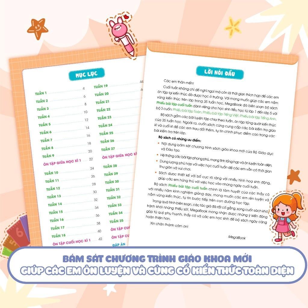 Cuối tuần không chỉ để nghỉ ngơi mà còn là thời gian thích hợp để các con ôn tập lại kiến thức đã được học ở trường. Với mong muốn giúp các con nắm vững kiến thức trên lớp trong 35 tuần học, MegaBook đã biên soạn bộ sách Phiếu bài tập cuối tuần dành riêng cho học sinh tiểu học từ lớp 1 đến lớp 5 với bộ 3 cuốn: Phiếu bài tập Toán, Phiếu bài tập Tiếng Việt, Phiếu bài tập Tiếng Anh. Bộ sách gồm các bài luyện tập chia theo tuần, ôn tập tổng quát kiến thức của 35 tuần học. Ngoài ra, cuốn sách cũng cung cấp các bài kiểm tra giữa kỳ và cuối kỳ để các con trau dồi thêm, tự tin chinh phục điểm cao trong các bài kiểm tra trên lớp. ƯU ĐIỂM CỦA CUỐN SÁCH PHIẾU BÀI TẬP CUỐI TUẦN TIẾNG VIỆT 4: