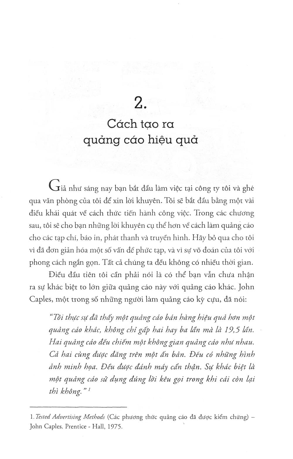 David Ogilvy là một trong những gương mặt nổi bật nhất của ngành quảng cáo, với danh xưng “Cha đẻ của nền quảng cáo hiện đại”. Các cuốn sách ông viết về nghệ thuật quảng cáo đều là những cuốn cẩm nang gối đầu giường của những người trong ngành, từ các vị giáo sư giảng dạy tại đại học đến những người thực sự lăn lộn tiếp xúc với khách hàng thường ngày. Họ gần như thuộc lòng những nguyên tắc và bí quyết của ông, đồng thời coi đó như kim chỉ nam trong nghề của m.ình.