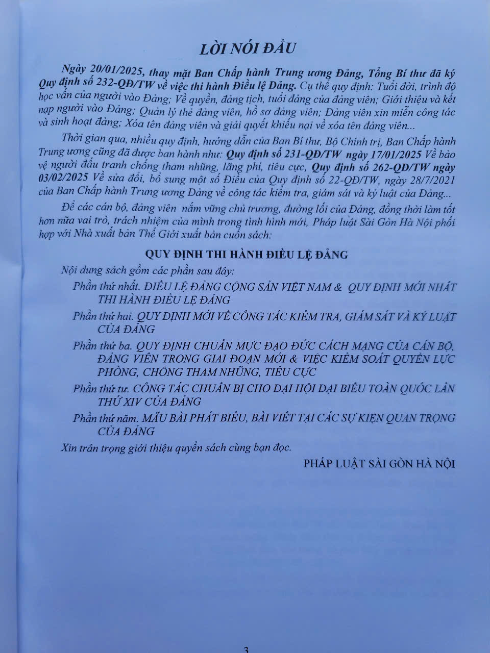 Ngày 20/01/2025, thay mặt Ban Chấp hành Trung ương Đảng, Tổng Bí thư đã ký Quy định số 232-QĐ/TW về việc thi hành Điều lệ Đảng. Cụ thể quy định: Tuổi đời, trình độ học vấn của người vào Đảng; Về quyền, đảng tịch, tuổi đảng của đảng viên; Giới thiệu và kết nạp người vào Đảng; Quản lý thẻ đảng viên, hồ sơ đảng viên; Đảng viên xin miễn công tác và sinh hoạt đảng; Xóa tên đảng viên và giải quyết khiếu nại về xóa tên đảng viên…
