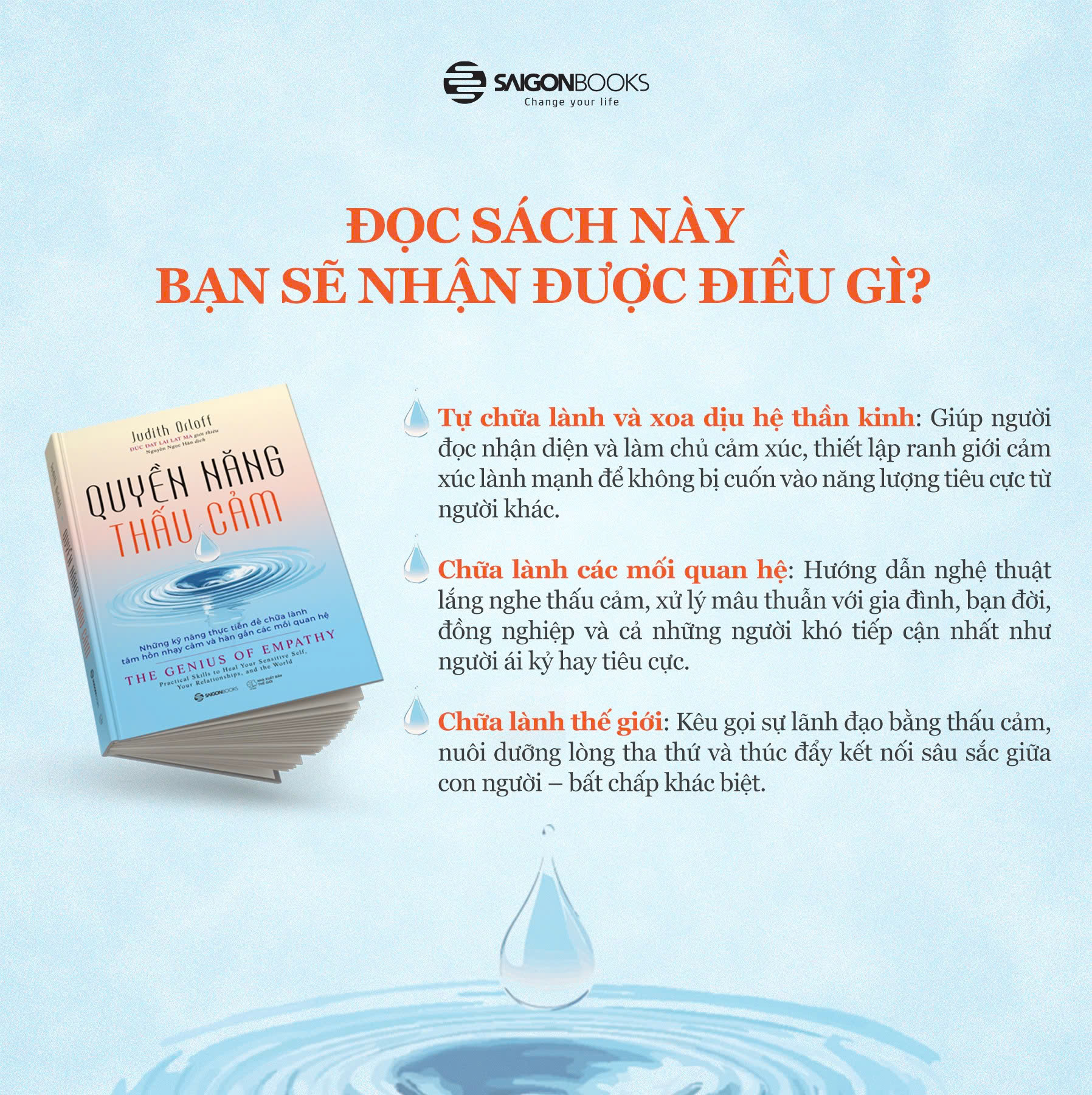 QUYỀN NĂNG THẤU CẢM – NHỮNG KỸ NĂNG THỰC TIỄN ĐỂ CHỮA LÀNH TÂM HỒN NHẠY CẢM VÀ HÀN GẮN CÁC MỐI QUAN HỆ Thấu cảm không chỉ là lòng tốt – đó là một kỹ năng sống còn Trong thời đại phân cực, ồn ào và kiệt sức cảm xúc như hiện nay, sự thấu cảm không còn là một phẩm chất xa xỉ – mà trở thành một kỹ năng thiết yếu. Trong Quyền năng thấu cảm, bác sĩ Judith Orloff – một bác sĩ tâm thần đồng thời là một người thấu cảm – mang đến một cẩm nang sâu sắc và dễ áp dụng giúp mỗi người học cách kết nối với trái tim mình, để sống mạnh mẽ mà không bị kiệt sức bởi cảm xúc. Cuốn sách mở ra một hành trình ba bước: thấu cảm với chính mình, với người khác và với thế giới – với nhiều chiến lược cụ thể, bài tập thực hành và chia sẻ cá nhân chân thật. Chữa lành từ bên trong: Khi thấu cảm bắt đầu với chính bạn Trước khi có thể quan tâm đến người khác một cách bền vững, bạn cần học cách đối xử tử tế với chính mình. Sách giúp bạn nhận diện những rào cản vô hình như thói quen tự chỉ trích, suy nghĩ quá mức, hay xu hướng "gánh vác" cảm xúc của người khác. Tác giả không chỉ chia sẻ kinh nghiệm lâm sàng, mà còn dẫn dắt bạn qua những bài tập cụ thể để biết nói “không”, thiết lập ranh giới và tự chăm sóc bản thân – một cách dũng cảm và lành mạnh. Trong Quyền năng thấu cảm, bác sĩ Judith Orloff – một chuyên gia tâm thần học và cũng là người thấu cảm – dẫn dắt bạn khám phá sức mạnh thực tiễn và sâu sắc của lòng thấu cảm. Cuốn sách được chia làm ba phần, mỗi phần là một bước tiến trên hành trình chữa lành. PHẦN 1 – TỰ CHỮA LÀNH Chương 1: Thấu cảm là chìa khóa sống còn trong thế giới hỗn loạn. Chương 2: Ngừng suy nghĩ quá mức, sống từ trái tim. Chương 3: Học cách tử tế với chính mình và thiết lập ranh giới lành mạnh. Chương 4: Loại bỏ những rào cản nội tâm như sợ hãi, kiêu ngạo, oán giận. PHẦN 2 – CHỮA LÀNH CÁC MỐI QUAN HỆ Chương 5: Lắng nghe bằng trái tim để người khác thấy được thấu hiểu. Chương 6: Thấu cảm trong gia đình, bạn bè và công sở. Chương 7: Cho đi một cách lành mạnh, không kiệt sức. Chương 8: Nhận diện người ái kỷ, độc hại – và bảo vệ chính mình. PHẦN 3 – CHỮA LÀNH THẾ GIỚI Chương 9: Lãnh đạo bằng thấu cảm – sức mạnh mới của người dẫn dắt. Chương 10: Tha thứ để giải phóng mình khỏi gánh nặng cảm xúc. Chương 11: Cùng nhau kết nối, chữa lành và xây dựng một thế giới bao dung hơn. “Quyền năng thấu cảm” là món quà tuyệt vời cho những người nhạy cảm, những nhà lãnh đạo, những người đang tìm kiếm sự cân bằng trong các mối quan hệ và bất kỳ ai đang khao khát một cuộc sống nhẹ nhõm, sâu sắc và có ý nghĩa hơn.