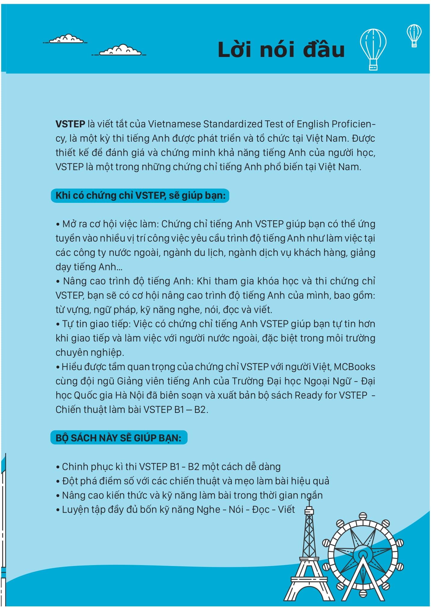 Hiểu được tầm quan trọng của chứng chỉ VSTEP với người Việt, MCBooks cùng đội ngũ Giảng viên tiếng Anh của Trường Đại học Ngoại Ngữ – Đại học Quốc gia Hà Nội đã biên soạn và xuất bản bộ sách “Ready for VSTEP – Chiến thuật làm bài VSTEP” gồm 2 cuốn B1 và B2