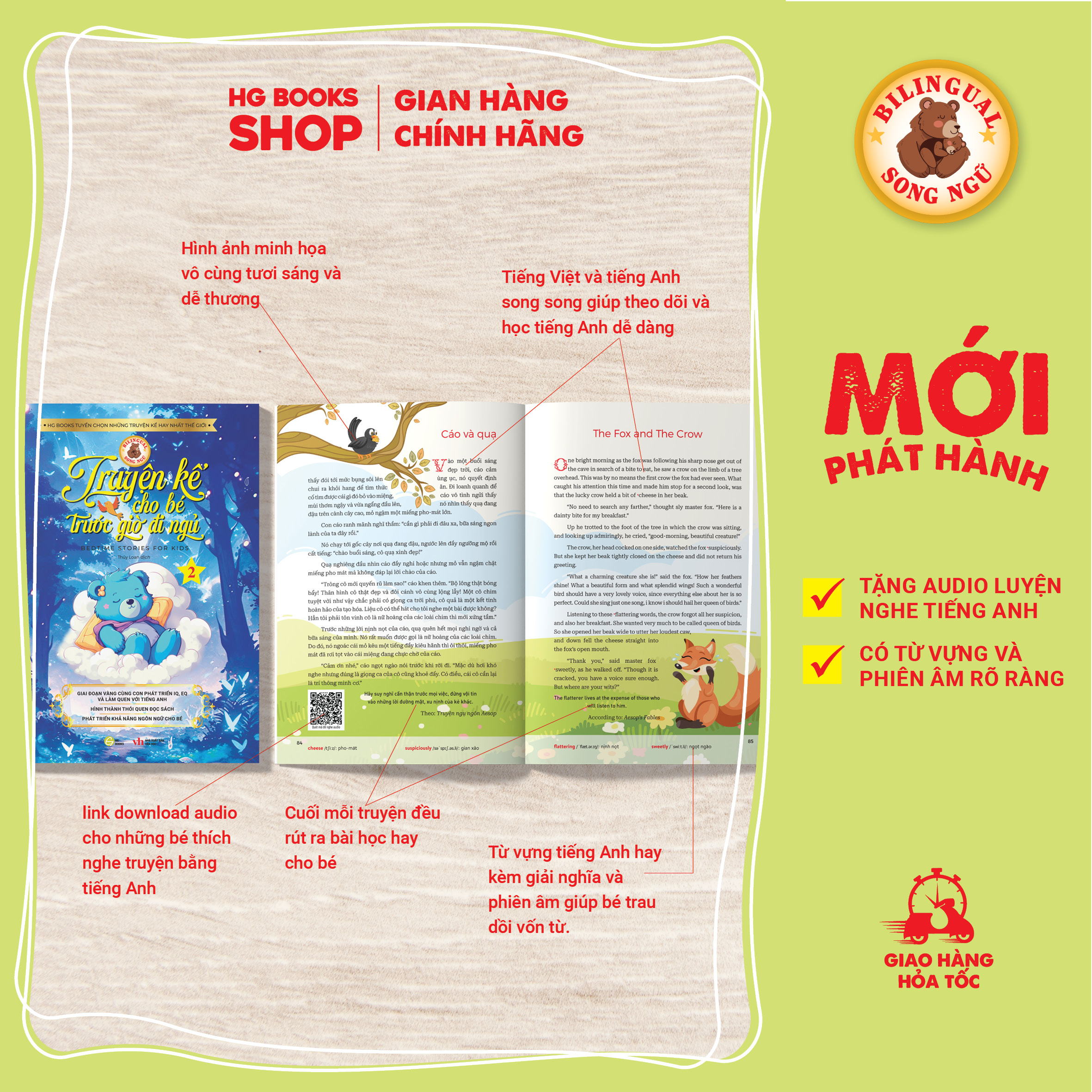 Cuối mỗi truyện đều có phần note từ vựng, phiên âm kèm link download phiên bản audio. Đây hứa hẹn sẽ là món quà vô cùng ý nghĩa mà bố mẹ dành cho các bé.