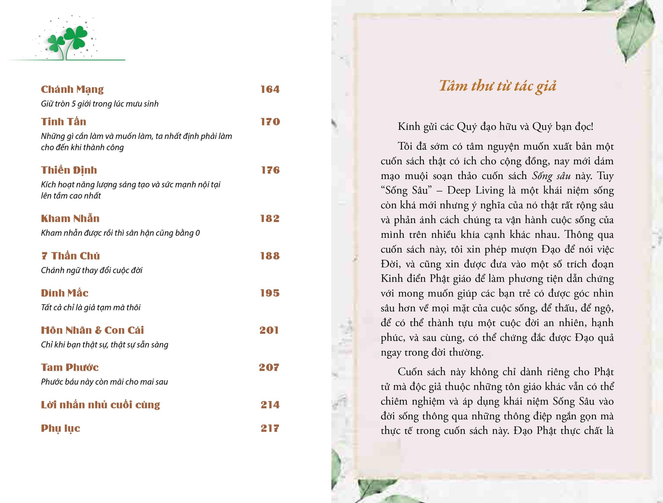 [ThaiHaBooks] Tuy “Sống Sâu” – Deep Living là một khái niệm sống còn khá mới nhưng ý nghĩa của nó thật rất rộng sâu và phản ánh cách chúng ta vận hành cuộc sống của mình trên nhiều khía cạnh khác nhau. Thông qua cuốn sách này, tác giả mượn Đạo để nói việc Đời, và cũng xin được đưa vào một số trích đoạn Kinh điển Phật giáo để làm phương tiện dẫn chứng với mong muốn giúp các bạn trẻ có được góc nhìn sâu hơn về mọi mặt của cuộc sống, để thấu, để ngộ, để có thể thành tựu một cuộc đời an nhiên, hạnh phúc, và sau cùng, có thể chứng đắc được Đạo quả ngay trong đời thường.