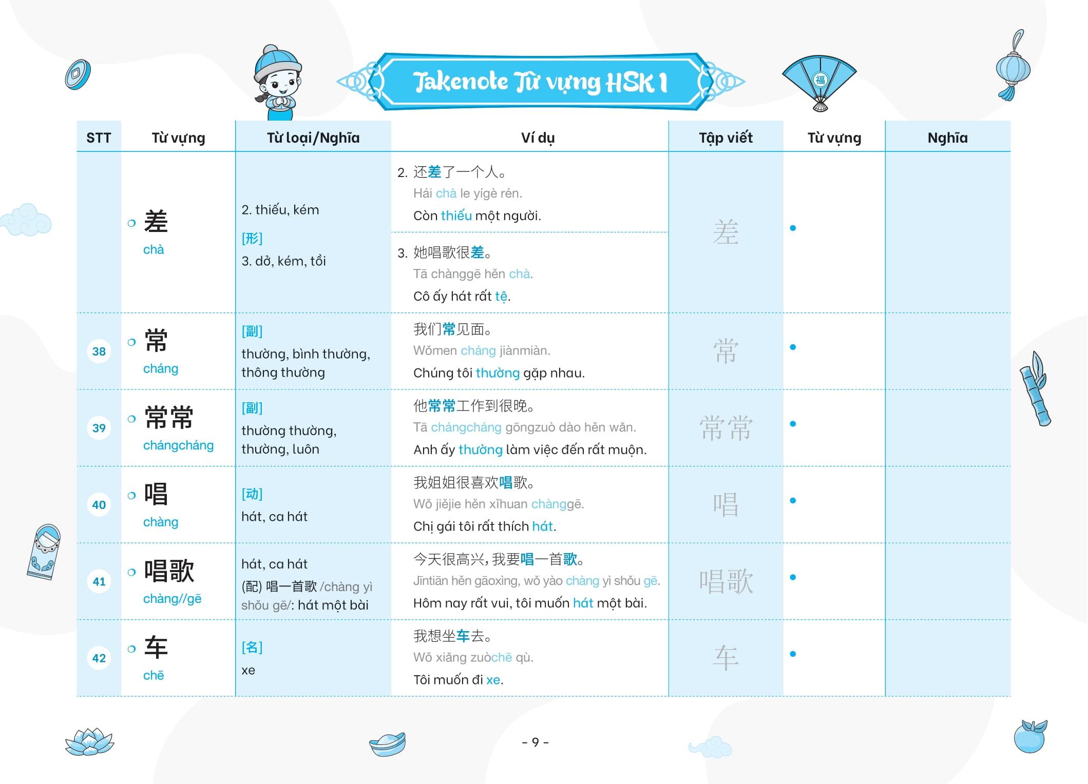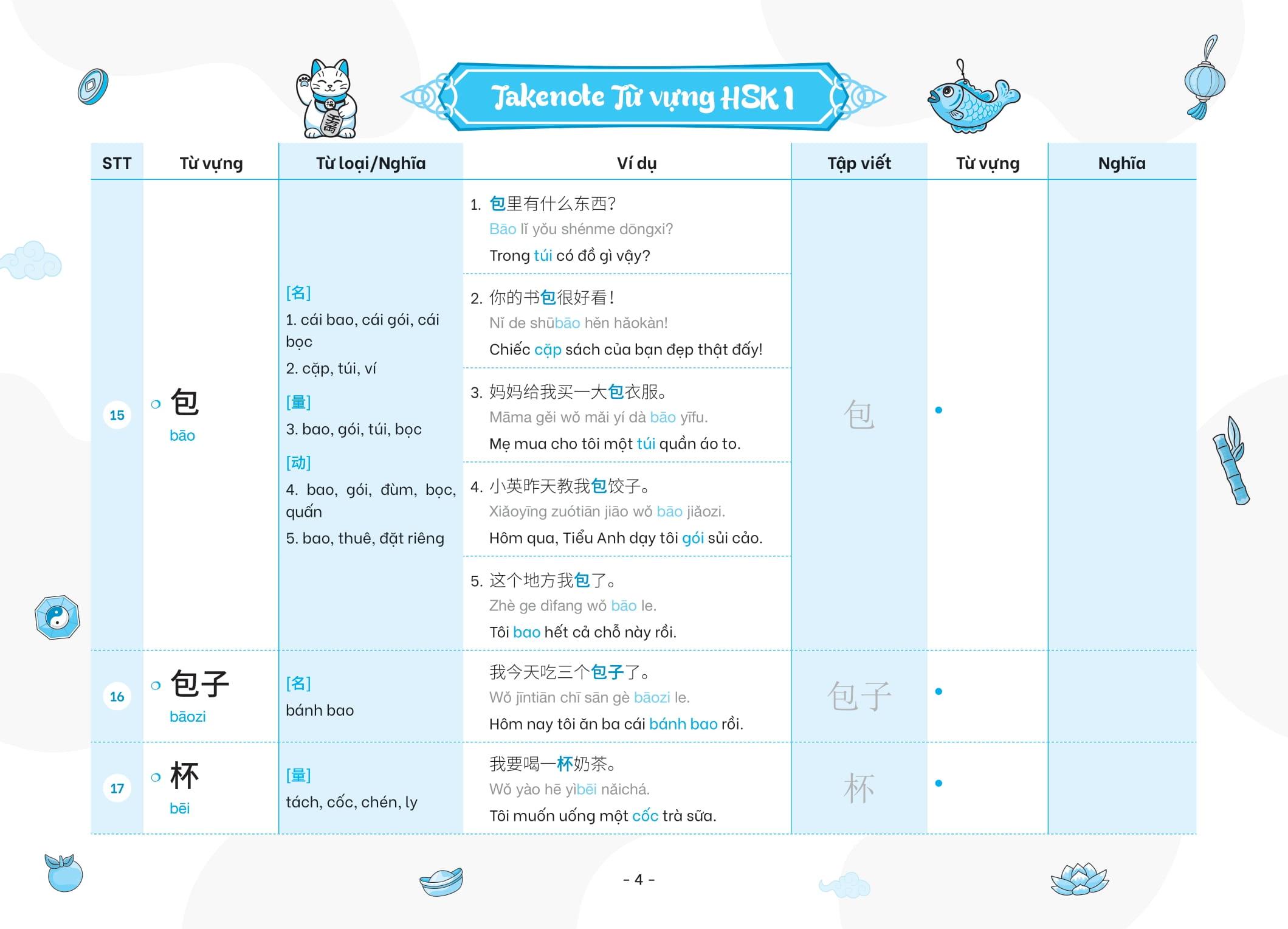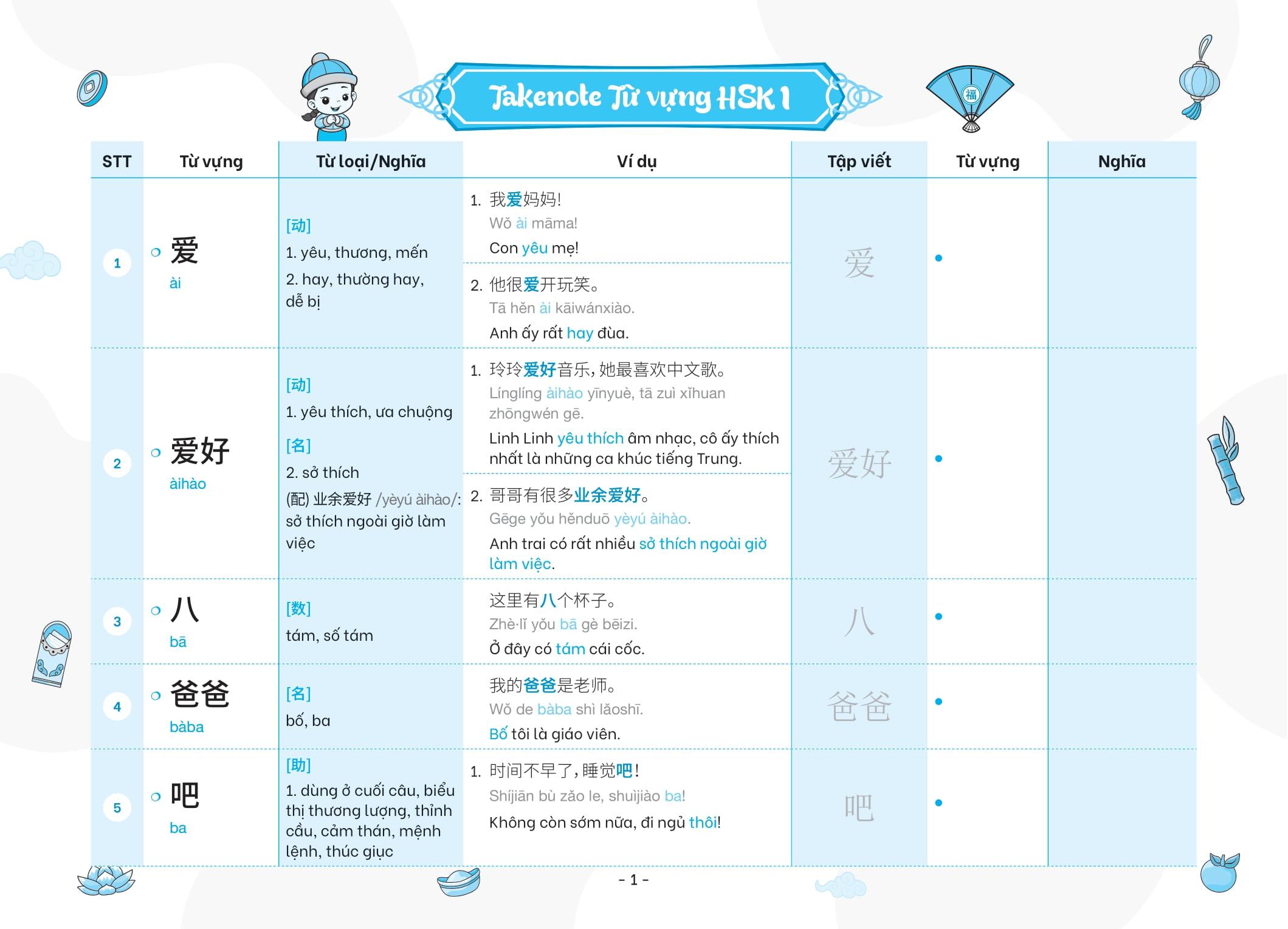 Takenote: Từ vựng HSK1 Tiếng Trung là cuốn sách học từ vựng được biên soạn theo chuẩn khung trình độ tiếng Trung 9 cấp mới của Hanban, cung cấp trọn bộ 500 từ vựng HSK1. Mỗi từ được trình bày kèm phiên âm, từ loại, ví dụ minh họa rõ ràng và các cấu trúc câu thường dùng, giúp người học ghi nhớ từ nhanh chóng và ứng dụng hiệu quả trong giao tiếp. Sách đi kèm file nghe MP3 chuẩn giọng bản xứ cho toàn bộ từ và ví dụ, hỗ trợ luyện phát âm, tăng phản xạ nghe – nói, phù hợp cho người mới bắt đầu học tiếng Trung.