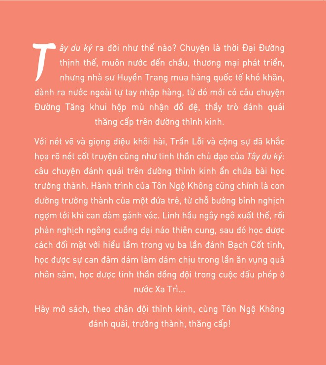 Với nét vẽ và giọng điệu khôi hài, Trần Lỗi và cộng sự đã khắc họa rõ nét cốt truyện cũng như tinh thần chủ đạo của Tây du ký: câu chuyện đánh quái trên đường thỉnh kinh ẩn chứa bài học trưởng thành. Hành trình của Tôn Ngộ Không cũng chính là con đường trưởng thành của một đứa trẻ, từ chỗ bướng bỉnh nghịch ngợm tới khi can đảm gánh vác. Linh hầu ngây ngô xuất thế, rồi phản nghịch ngông cuồng đại náo thiên cung, sau đó học được cách đối mặt với hiểu lầm trong vụ ba lần đánh Bạch Cốt tinh, học được sự can đảm dám làm dám chịu trong lần ăn vụng quả nhân sâm, học được tinh thần đồng đội trong cuộc đấu phép ở nước Xa Trì...