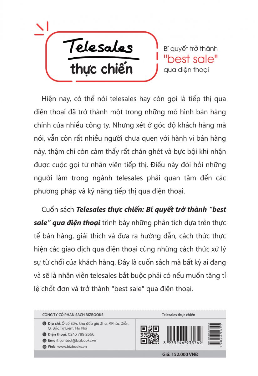 Từng dòng lật giở trang sách khiến bạn như được truyền cảm hứng về tình yêu nghề, sự kiên trì trên hành trình xây “từng viên gạch” của danh tiếng, hình ảnh thương hiệu tốt, giúp bạn chạm gần hơn tới trái tim khách hàng, nâng cao hiệu suất, thúc đẩy tăng trưởng doanh số cho công ty. Đặc biệt, cuốn sách “Telesales Thực chiến” còn hỗ trợ App nghe miễn phí và nhận ngay Audiobooks khi quét mã QR đằng sau sách!