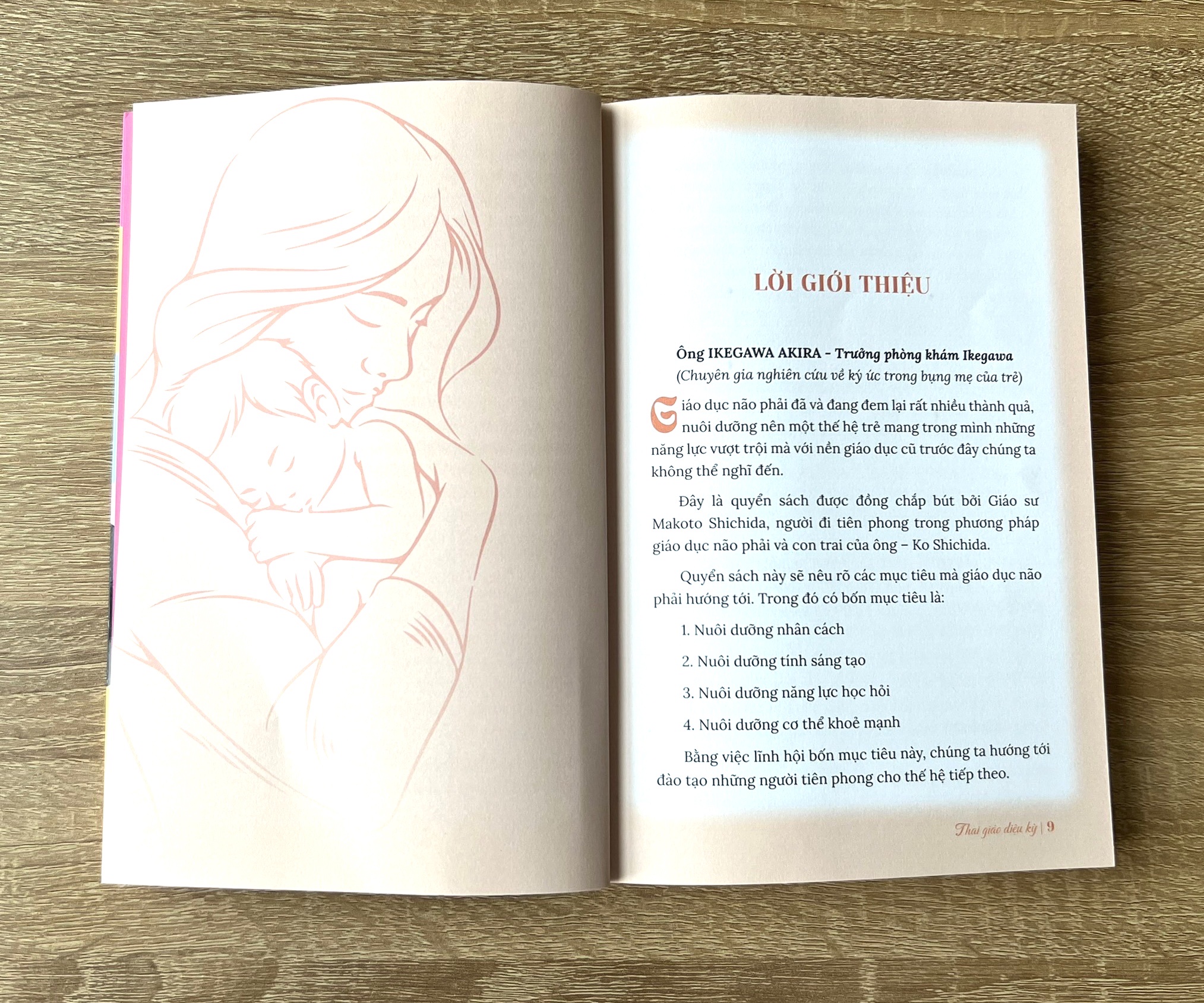 Thai giáo diệu kỳ theo phương pháp Shichida" là một sách thai giáo nổi bật, hướng dẫn ba mẹ cách dạy con từ trong bào thai thông qua tình yêu và sự kết nối tâm hồn. Phương pháp này giúp kích hoạt sức mạnh tiềm ẩn của não phải thai nhi, tập trung vào bốn mục tiêu chính: nuôi dưỡng nhân cách, phát triển sáng tạo, kích thích năng lực học hỏi và xây dựng cơ thể khỏe mạnh.