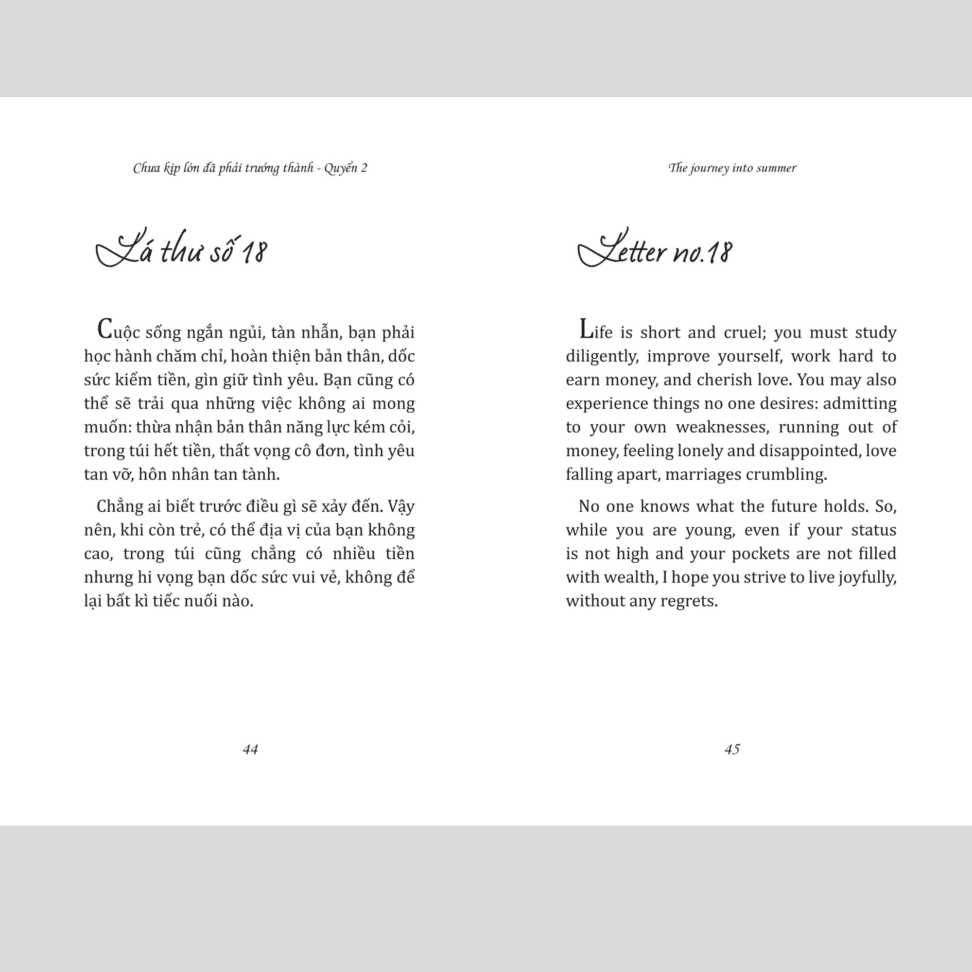 Những lời tâm tình về tuổi trẻ dám sống hết mình vì ước mơ được viết bằng hai ngôn ngữ Anh - Việt trong cuốn sách "THE JOURNEY INTO SUMMER - Chưa kịp lớn đã phải trưởng thành quyển 2" sẽ truyền cảm hứng cho bạn thêm tin vào chính mình.
