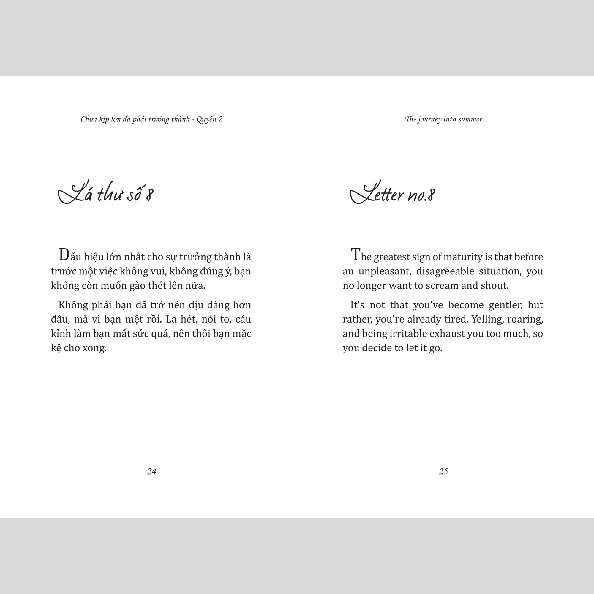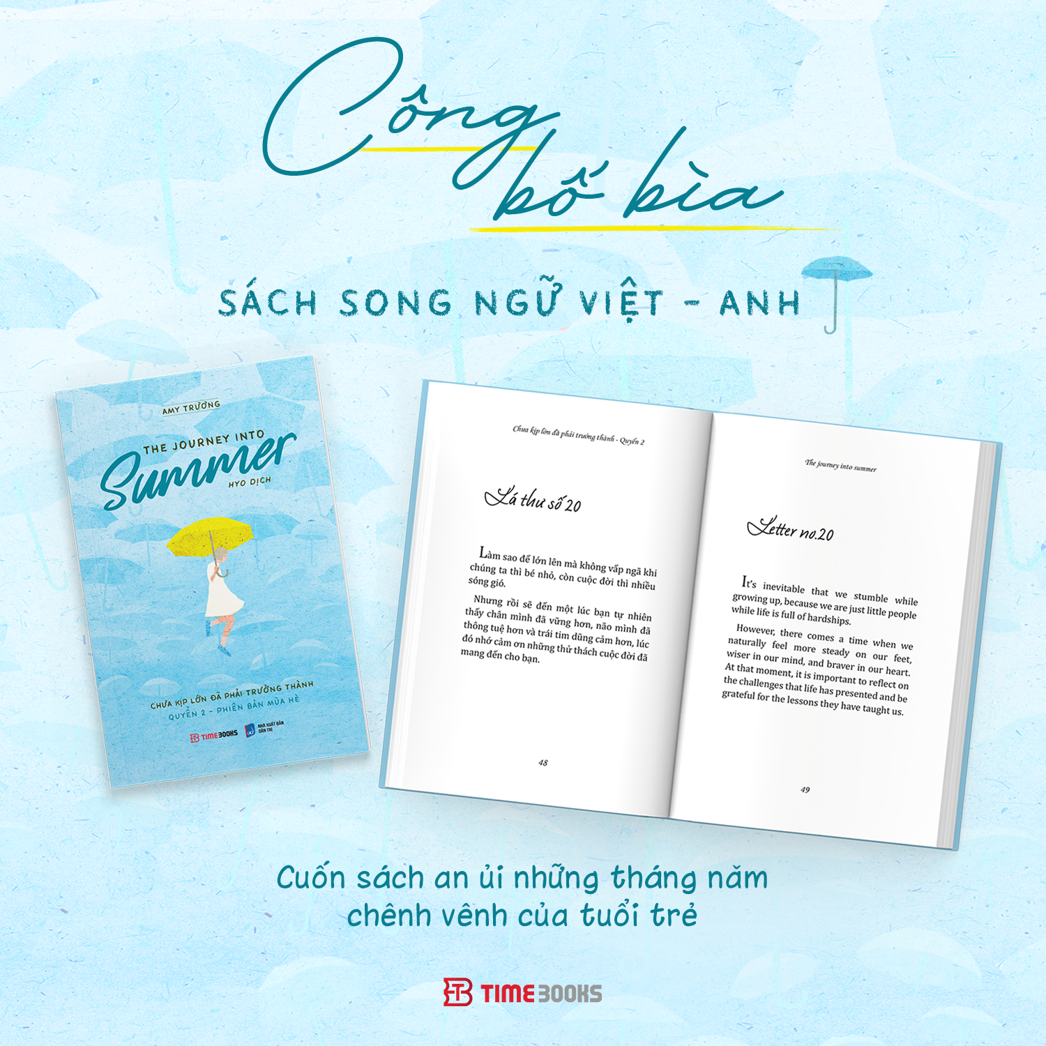 - Sách song ngữ thực chiến, không tốn thời gian học tập, đáng đọc ít nhất 1 lần trong đời. Những năm hai mươi, có nhiều lúc chúng ta hoang mang về con đường mình đang đi, mơ hồ về những quyết định, lo sợ về tương lai, hoài nghi năng lực của bản thân… Nhưng đã có ai nói với bạn chưa, rằng tuổi trẻ là lúc chúng ta học cách làm đúng chứ không phải không được phép sai. Vậy nên đừng lo lắng sẽ lạc đường! Những lời tâm tình về tuổi trẻ dám sống hết mình vì ước mơ được viết bằng hai ngôn ngữ Anh - Việt trong cuốn sách "THE JOURNEY INTO SUMMER - Chưa kịp lớn đã phải trưởng thành quyển 2" sẽ truyền cảm hứng cho bạn thêm tin vào chính mình. Đồng thời giúp bạn nâng cao trình độ ngoại ngữ, để mở ra những cơ hội mới, bước tới những chân trời xa hơn, chạm đến những ước mong mà bạn hằng mơ ước.