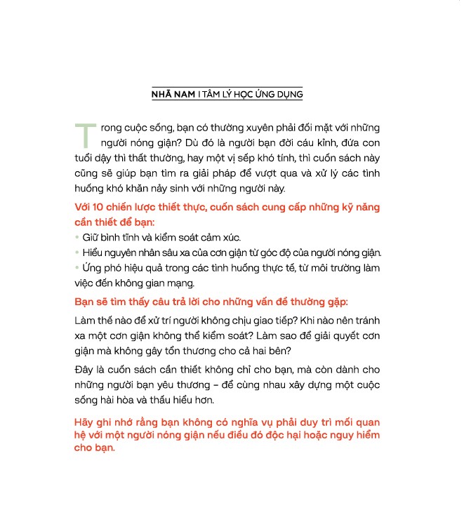 Trong cuộc sống bạn có thường xuyên phải đối mặt với những người nóng giận? Dù đó là người bạn đời cáu kỉnh, đứa con tuổi dậy thì thất thường, hay một vị sếp khó tính, thì cuốn sách này sẽ giúp bạn tìm ra giải pháp để vượt qua và xử lý các tình huống khó khăn nảy sinh với những người này.
