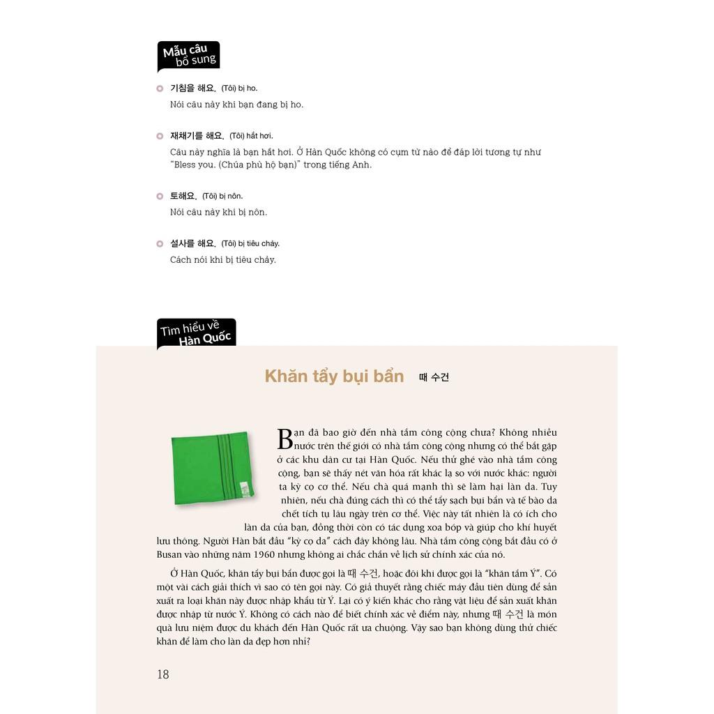 Mỗi bài học được mở đầu bằng phần Đối thoại, nơi bạn tìm thấy các mẩu nói chuyện căn bản trong đời sống thường ngày của người Hàn Quốc, như "Ngày mai gặp nhé", "Bạn ăn trưa chưa" hay "Đừng quá vội" Bên dưới mẩu đối thoại là đề mục "Kiểm tra phát âm", giúp bạn nắm được những điểm thường hay sai khi phát âm. Kế tiếp là các phần Từ & cụm từ, Chủ điểm ngữ pháp, Luyện tập mẫu câu bổ sung và Tìm hiểu về Hàn Quốc, hỗ trợ bạn học và thực hành tiếng Hàn thật toàn diện. Mong rằng bộ sách sẽ giúp bạn thật sự yên tâm và có thêm cảm hứng trong quá trình học tiếng Hàn.