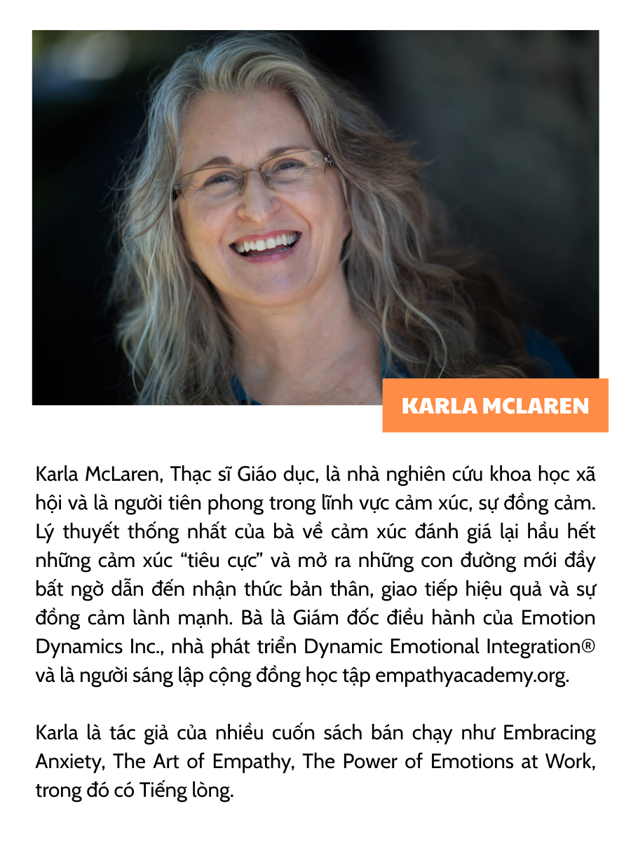 • Hiểu biết và bài tập thực hành về sự lo lắng, khám phá sự cô đơn và nhiều cảm xúc khác… Thông tin tác giả: Karla McLaren, Thạc sĩ Giáo dục, là nhà nghiên cứu khoa học xã hội và là người tiên phong trong lĩnh vực cảm xúc, sự đồng cảm. Lý thuyết thống nhất của bà về cảm xúc đánh giá lại hầu hết những cảm xúc “tiêu cực” và mở ra những con đường mới đầy bất ngờ dẫn đến nhận thức bản thân, giao tiếp hiệu quả và sự đồng cảm lành mạnh. Bà là Giám đốc điều hành của Emotion Dynamics Inc., nhà phát triển Dynamic Emotional Integration và là người sáng lập cộng đồng học tập . Karla là tác giả của nhiều cuốn sách bán chạy như Embracing Anxiety, The Art of Empathy, The Power of Emotions at Work, trong đó có Tiếng lòng.