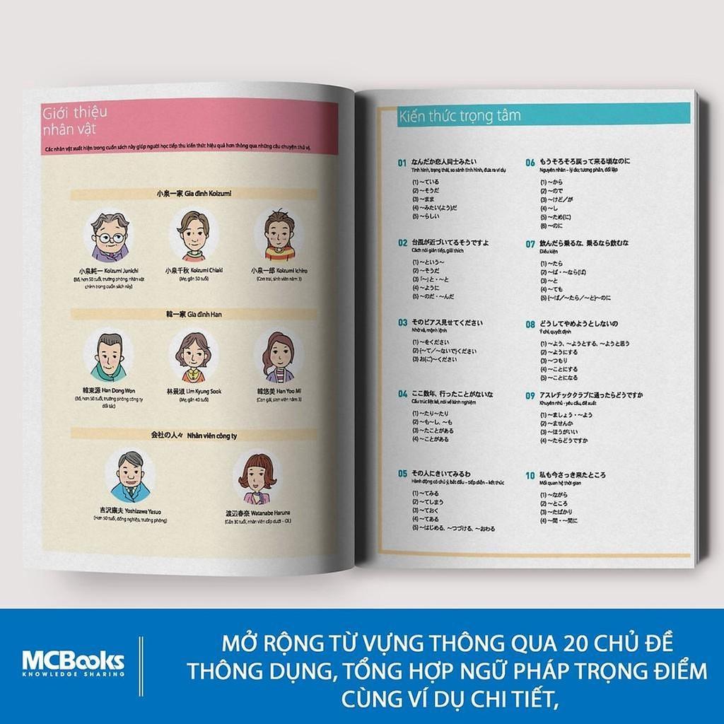 Nội dung sách được sắp xếp theo thứ tự từ dễ đến khó thông qua các mẩu truyện Yonkoma, hội thoại mẫu, kiến thức trọng tâm và bài tập luyện tập.