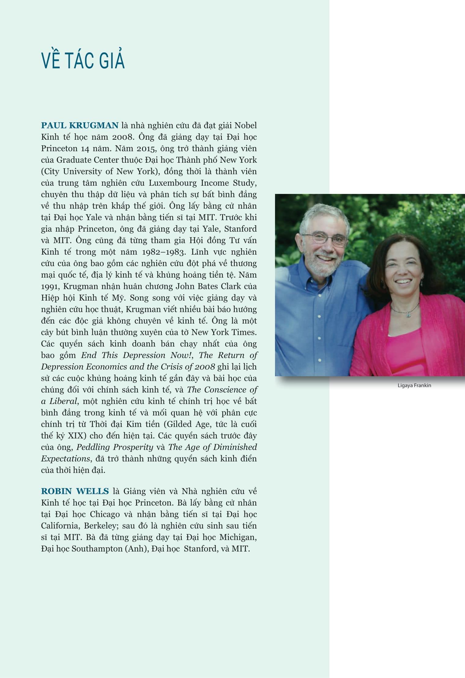 Paul Krugman là nhà kinh tế học lỗi lạc, chủ nhân duy nhất của của Giải Nobel Kinh tế học năm 2008. Ông cùng người cộng sự của m.ình là Robin Wells đã viết nên nhiều câu chuyện của các nhà kinh tế học dưới dạng các mô hình – cho dù với mục đích gì thì các mô hình kinh tế cũng là những câu chuyện về cách vận hành của thế giới. Các tác giả tin rằng, các sinh viên sẽ hiểu biết và đánh giá cao các mô hình kinh tế hơn nếu chúng được trình bày – càng nhiều càng tốt – trong bối cảnh thực tế, vừa minh họa các khái niệm kinh tế học, vừa chạm vào những mối quan tâm mà tất cả chúng ta phải đối mặt khi sống trong một thế giới được định hình bởi các thế lực kinh tế.