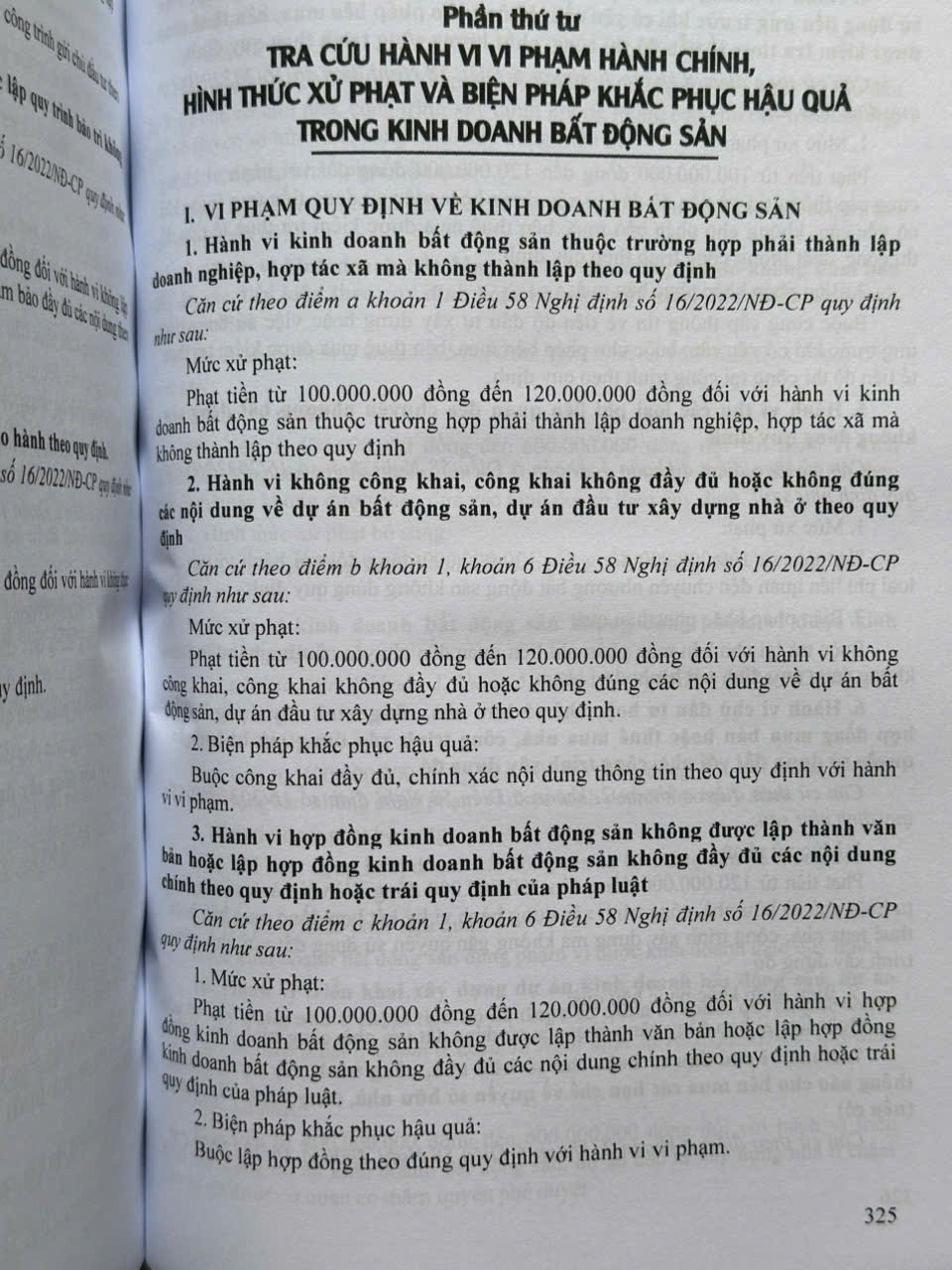 Phần thứ tư. Tra cứu hành vi vi phạm hành chính, hình thức xử phạt và biện pháp khắc phục hậu quả trong kinh doanh bất động sản.