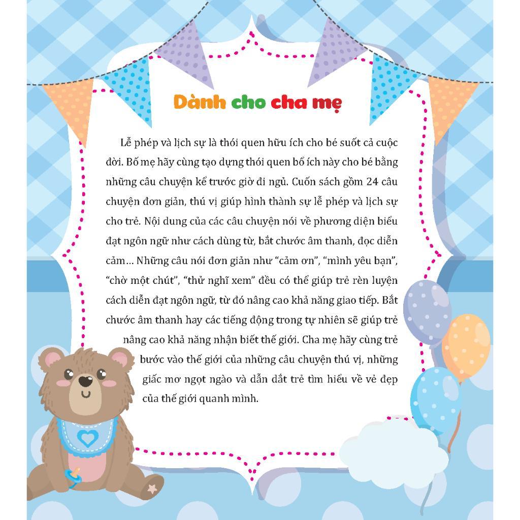 Mua tại TiktokLễ phép và lịch sự là thói quen hữu ích cho bé suốt cả cuộc đời . Bố mẹ hãy cùng tạo dựng thói quen bổ ích này cho bé bằng những câu chuyện kể trước giờ đi ngủ . Cuốn sách gồm 24 câu chuyện đơn giản , thúi vị giúp hình thành sự lễ phép và lịch sự cho trẻ .