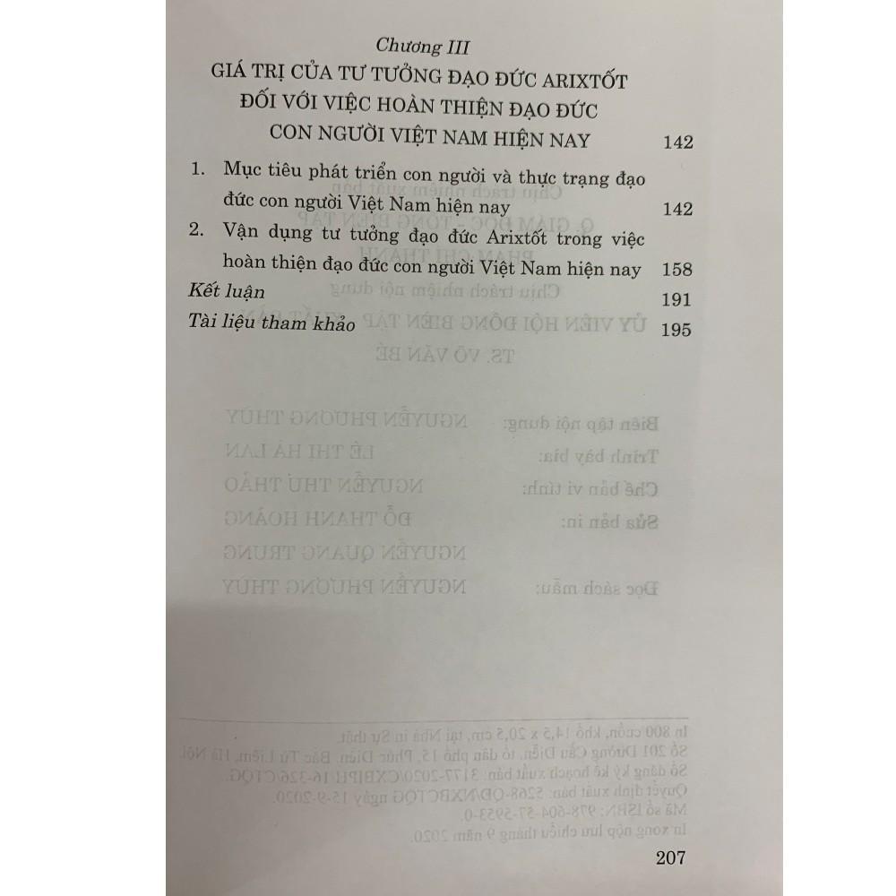 Nhà xuất bản Chính trị quốc gia Sự thật Tác giả: TS. Phạm Quỳnh Trang Năm xuất bản: 2020 Số trang: 208 Nội dung cuốn sách được chia thành ba chương: Chương 1: Tiền đề cho sự hình thành tư tưởng đạo đức của Arixtốt; Chương 2: Tư tưởng đạo đức của Arixtốt; Chương 3: Giá trị của tư tưởng đạo đức Arixtốt đối với việc hoàn thiện đạo đức con người Việt Nam hiện nay.