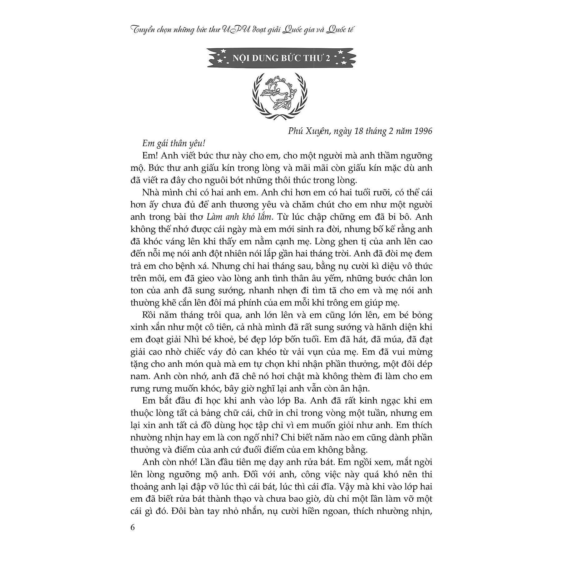 Cuốn sách này chính là của các bạn cùng trang lứa tuổi, nó sẽ giúp cho các em học sinh cấp THCS nói riêng và THPT nói chung có thêm một tài liệu tham khảo, tích lũy thêm kinh nghiệm để tham gia các cuộc thi Viết thư UPU sắp tới. Hãy đọc kĩ và tham khảo những dòng giãi bày của các bạn qua cách diễn đạt, cách triển khai ý, cách so sánh, lập luận, cách đưa cảm xúc vào bức thư rồi các em sẽ tìm được hướng đi của riêng mình.