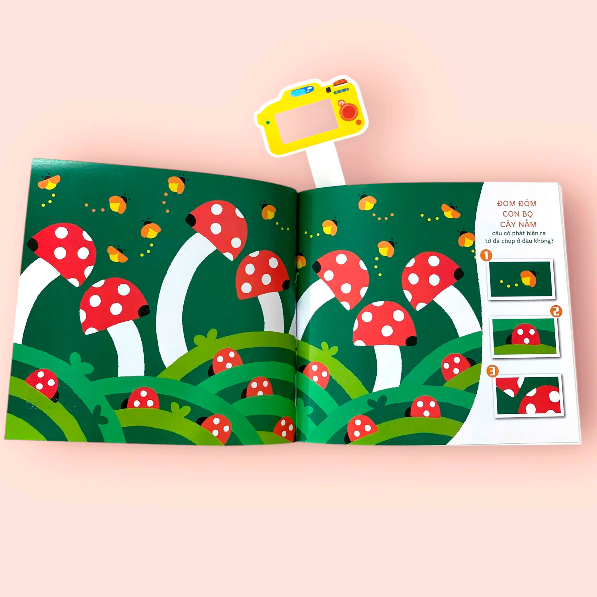 Trong cuốn sách này, bé sẽ tham gia vào các trò chơi tìm kiếm các bức ảnh giống với ảnh mẫu, quan sát và đối chiếu với bức ảnh mẫu trong những bối cảnh như: tìm bức ảnh chụp một góc cây trong khu rừng, tìm vị trí chiếc dù trên bầu trời, hay phát hiện những chi tiết thú vị trong bức tranh về đêm.