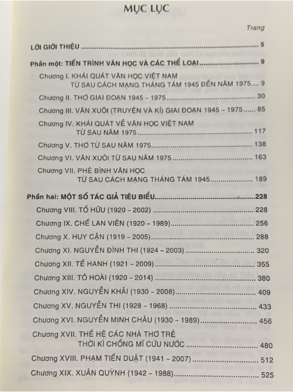 Mua tại TiktokNội dung gồm có: Phần 1: Tiến trình Văn học và các thể loại: gồm có 7 chương, khái quát về hai giai đoạn văn học 1945- 1975 và từ sau năm 1975, tiến trình và thành tựu của các thể loại ở mỗi giai đoạn Phần 2: Một số tác giả tiêu biểu: gồm 12 chương. các tác giả được lựa chọn vừa tiêu biểu cho thành tựu ở mỗi thể loại!