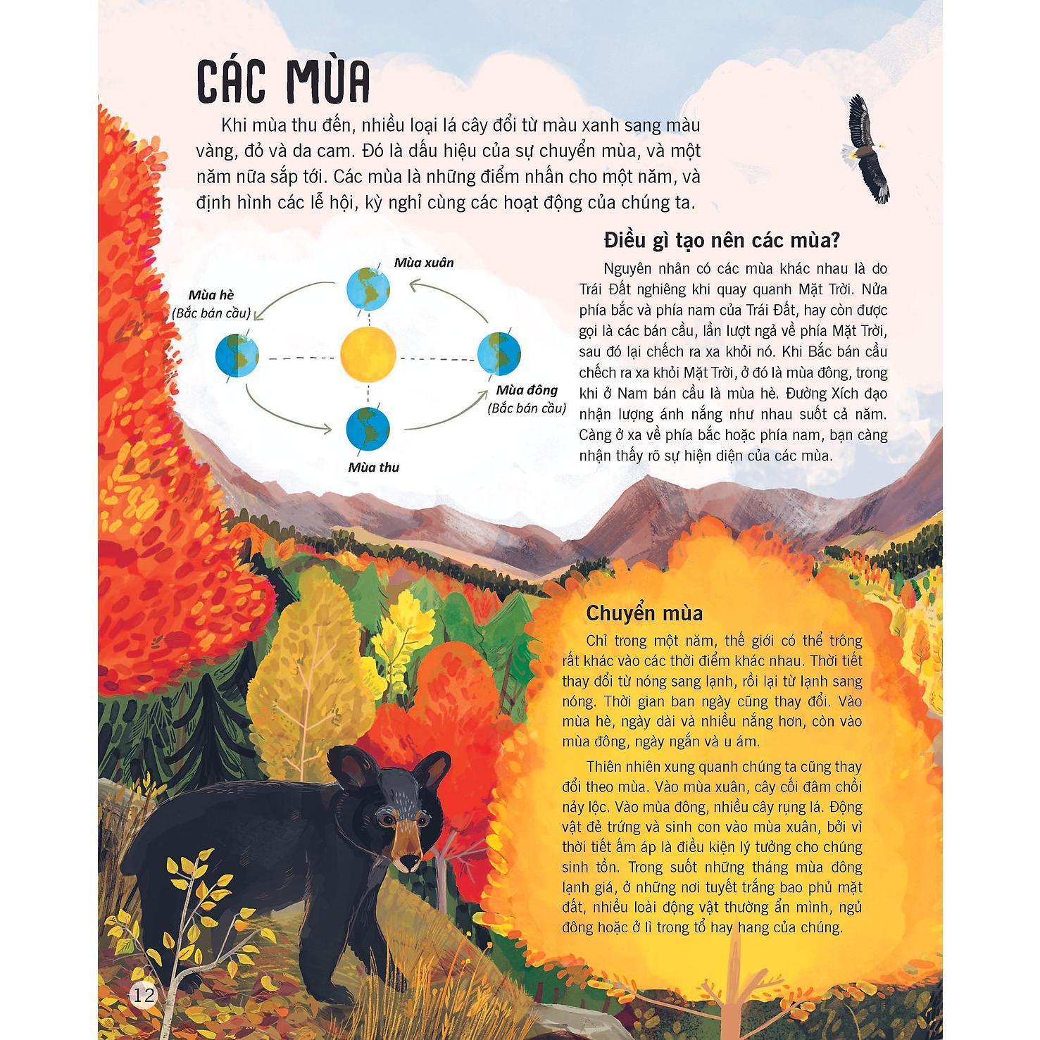 Tác giả: Lời: Anna Claybourne; Minh họa: Sarah Edmonds Dịch giả: Thu Trang Độ tuổi: Dành cho độ tuổi 6-12 Kích thước: 20,5x25 Nhà xuất bản: NXB Thanh Niên Năm xuất bản: 2024 Số trang: 64 trang ruột + trang bìa 3 (xinhe) Mọi lúc, mọi nơi xung quanh chúng ta, vạn vật liên tục biến đổi. Ngày chuyển thành đêm, rồi đêm lại hóa thành ngày. Mặt Trăng đi ngang qua bầu trời, mỗi đêm trông lại một khác. Thủy triều rút đi và dâng lên, cây trồng nảy mầm và phát triển, chim chóc nở ra từ trứng, ngắm nhìn thế giới lần đầu tiên. Bốn mùa thay đổi, mỗi mùa lại có một kiểu thời tiết khác nhau. Điều này giúp chúng ta quyết định mình nên làm gì và nên đi đâu khi ngày tháng dần trôi.