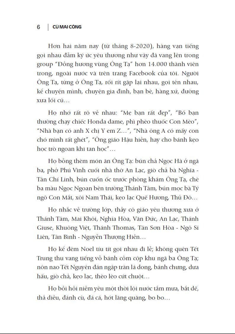 Không dừng lại ở đó, đan xen trong những câu chuyện vui buồn của cư dân Ông Tạ là tuổi thơ đầy màu sắc của tác giả Cù Mai Công. Anh là một nhân chứng của Ông Tạ từ những ngày đầu tiên, đi qua những tháng ngày đẹp nhất cũng như những thời khắc bi thương nhất của cộng đồng này. Có cảm tưởng như dấu chân anh hẳn đã in khắp vùng Ông Tạ nên anh mới có thể có mặt từ mọi câu chuyện vặt vãnh của trẻ con cho đến chứng kiến những biến động lớn của thời cuộc. Anh rành rẽ gia phả của mỗi gia đình, nhớ như in những chi tiết “thời xửa thời xưa” mà có khi “chính chủ” cũng đã quên.