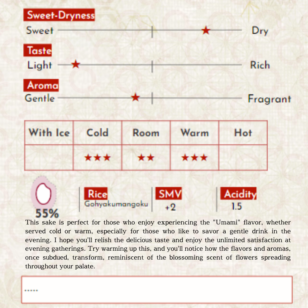 Sake Type: Light & Clean Độ cồn : 16 - 16.5%                                                 Mài gạo: 55% Gạo dùng: Gohyakumangoku  SMV: +2 Độ axit: 1.5 Thành phần: gạo (sản xuất trong nước), men gạo koji (gạo sản xuất trong nước) NSX: xem trên nhãn (năm/tháng) HSD: theo thông lệ quốc tế không có HSD Hướng dẫn bảo quản: nơi khô ráo thoáng mát, tránh ánh nắng mặt trời. Thông tin cảnh báo: Trên 20 tuổi mới được phép dùng. Phụ nữ có thai hoặc cho con bú nên hạn chế sử dụng. Pháp luật nghiêm cấm lái xe sau khi uống. NK&PP: CÔNG TY TNHH STARMARK VIETNAM Xuất xứ: Nhật Bản