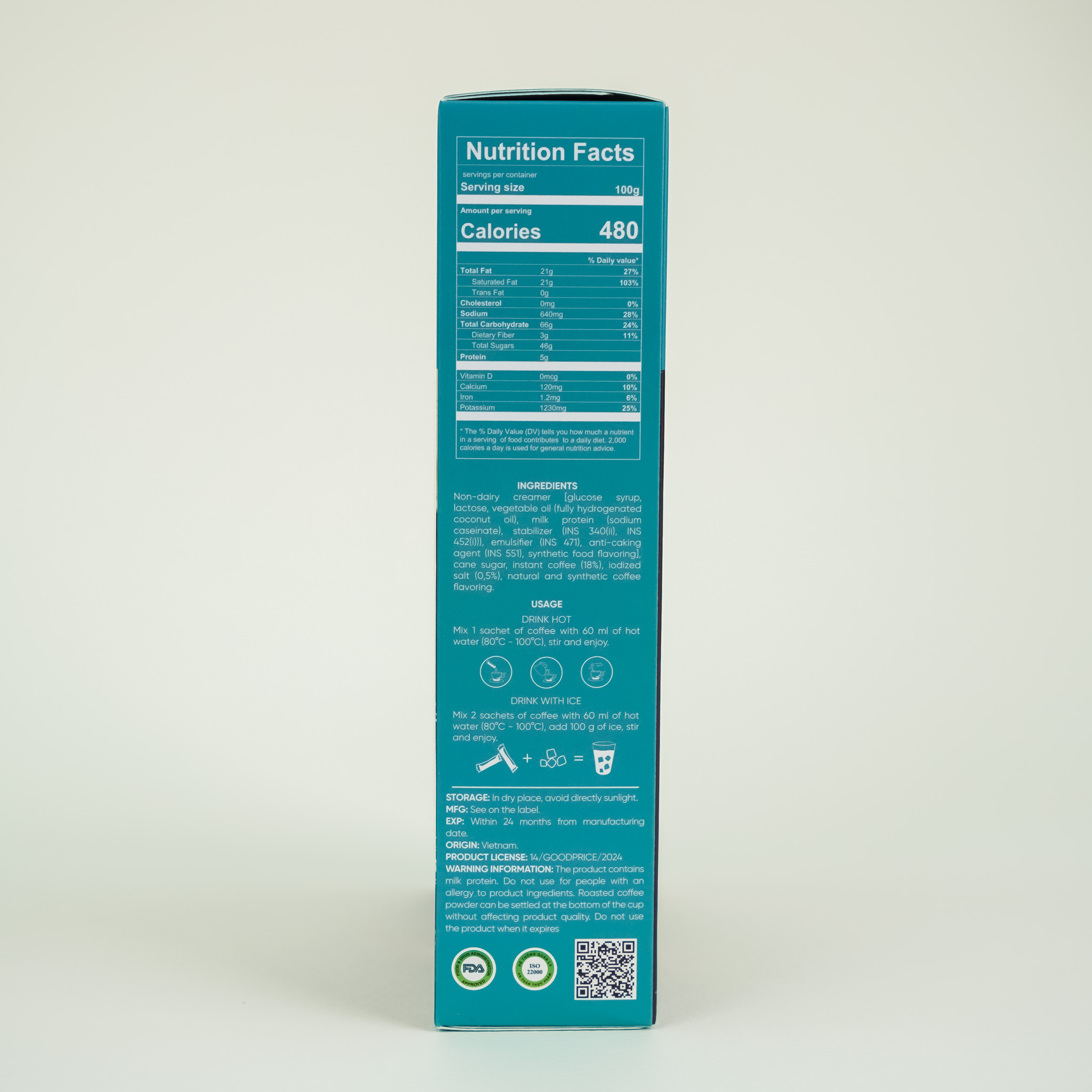 Thành phần: bột cà phê hòa tan 10%, đường, kem béo thực vật (non dairy creamer), bột kem tạo bọt, đường malto, muối 1%, hương cà phê Xuất xứ: Việt Nam Khối lượng tịnh: 200gr