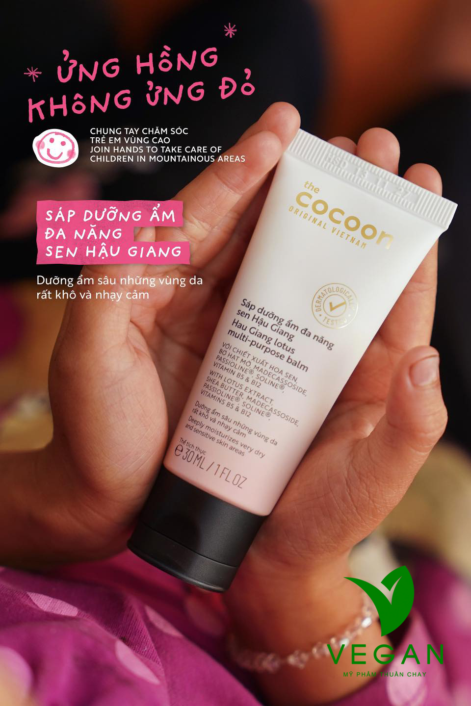Trong khuôn khổ của chương trình “Ửng Hồng Không Ửng Đỏ” – Chung tay chăm sóc trẻ em vùng cao, Cocoon x UNESCO-CEP ra mắt 3 phiên bản giới hạn của sản phẩm Sáp Dưỡng Ẩm Đa Năng Sen Hậu Giang. Các phiên bản này sử dụng nguồn tranh vẽ từ Em’s - một dự án cộng đồng của UNESCO-CEP hướng tới việc phát triển khả năng sáng tạo nghệ thuật của trẻ em, thanh thiếu niên Việt Nam.
