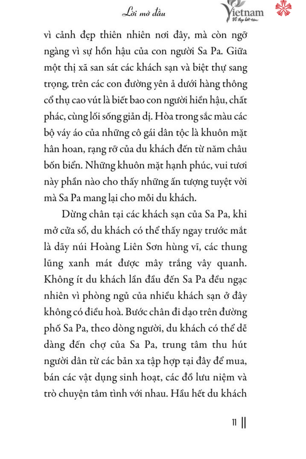 Là một thị xã của tỉnh Lào Cai, thuộc vùng Tây Bắc Bộ, Việt Nam, Sa Pa nằm ở độ cao 1.600m so với mực nước biển. Với diện tích khoảng 678,6km2, đây là nơi sinh sống chủ yếu của các dân tộc Mông, Dao, Tày, Giáy, Xá Phó, Kinh, Hoa. Sa Pa - vùng đất khiêm nhường, lặng lẽ nhưng ẩn chứa bao điều kỳ diệu của thiên nhiên. Nơi đây có khí hậu trong lành mát mẻ, đa dạng sắc thái. Thiên nhiên ưu ái ban tặng cho tiết