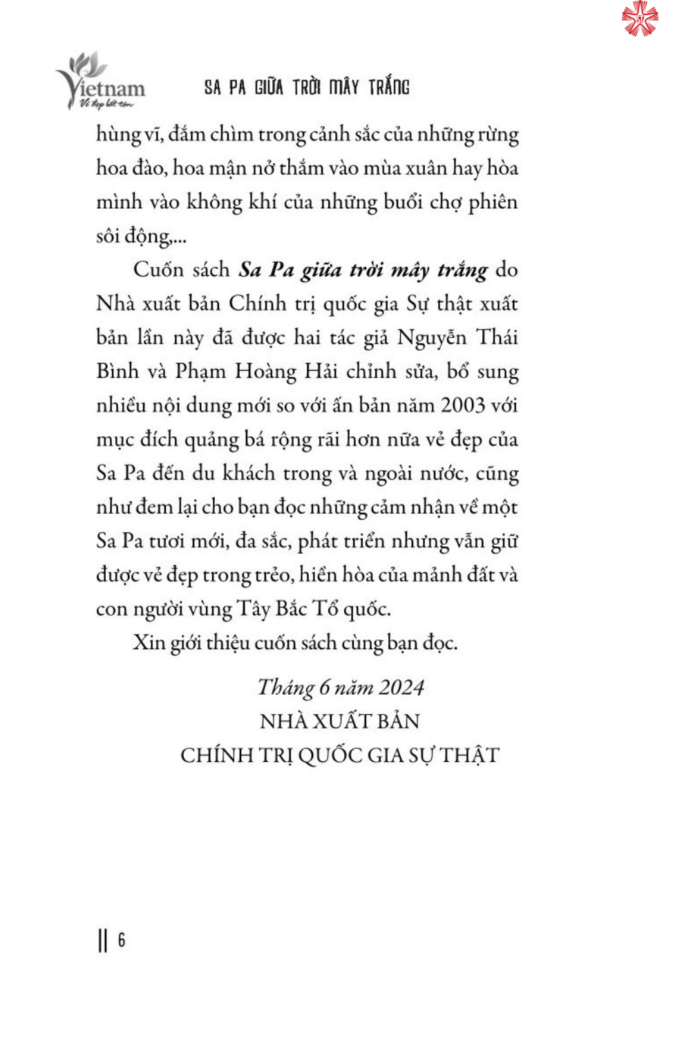 Cuốn sách Sa Pa giữa trời mây trắng do Nhà xuất bản Chính trị quốc gia Sự thật xuất bản lần này đã được hai tác giả Nguyễn Thái Bình và Phạm Hoàng Hải chỉnh sửa, bổ sung nhiều nội dung mới so với ấn bản năm 2003 với mục đích quảng bá rộng rãi hơn nữa vẻ đẹp của Sa Pa đến du khách trong và ngoài nước, cũng như đem lại cho bạn đọc những cảm nhận về một Sa Pa tươi mới, đa sắc, phát triển nhưng vẫn giữ được vẻ đẹp trong trẻo, hiền hòa của mảnh đất và con người vùng Tây Bắc Tổ quốc.