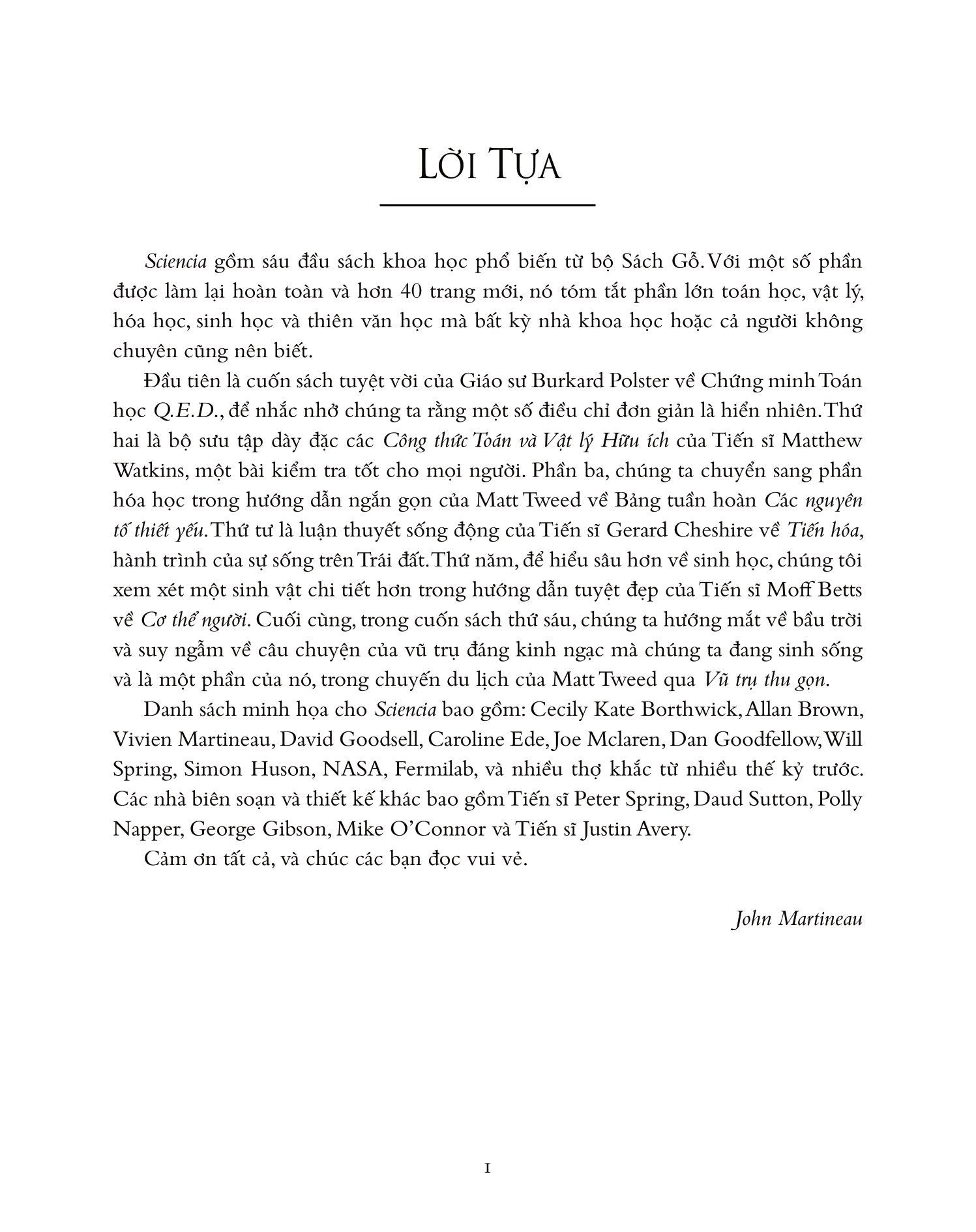 Sciencia - Toán học, Vật lý, Hóa học, Sinh học, và Thiên văn học là một cuốn sách đại chúng và cũng khá đặc biệt. Nó là một dạng sổ tay cho học sinh, nhưng đôi khi có giải thích vắn tắt một số bước tiến khoa học hay ý nghĩa của chúng. Cũng có những phần rất “gợi cảm hứng trí tuệ”. Đơn cử như phần về “hoàn vũ cân chỉnh” (A finely tuned Universe): Nếu lực trọng trường tăng thêm chỉ 0,1% thì vũ trụ sẽ đầy rẫy những lỗ đen, nếu nó yếu hơn 0,1% thì các thiên hà sẽ không hình thành được; Nếu Big Bang tỏa năng lượng ít hơn thì vũ trụ sẽ bị sụp, nhiều hơn thì các ngôi sao không hình thành được. Mọi thứ đều như được sắp đặt để hoàn vũ như ngày nay tồn tại (như thể có sự sắp đặt của Thượng đế vậy, và thật ra thì con người cũng thế). Sciencia bao hàm một nền tảng khoa học hoàn chỉnh cho cả học sinh lẫn những ai yêu thích các môn tự nhiên, để tìm hiểu, quy nạp và phát triển thêm về đam mê khoa học .
