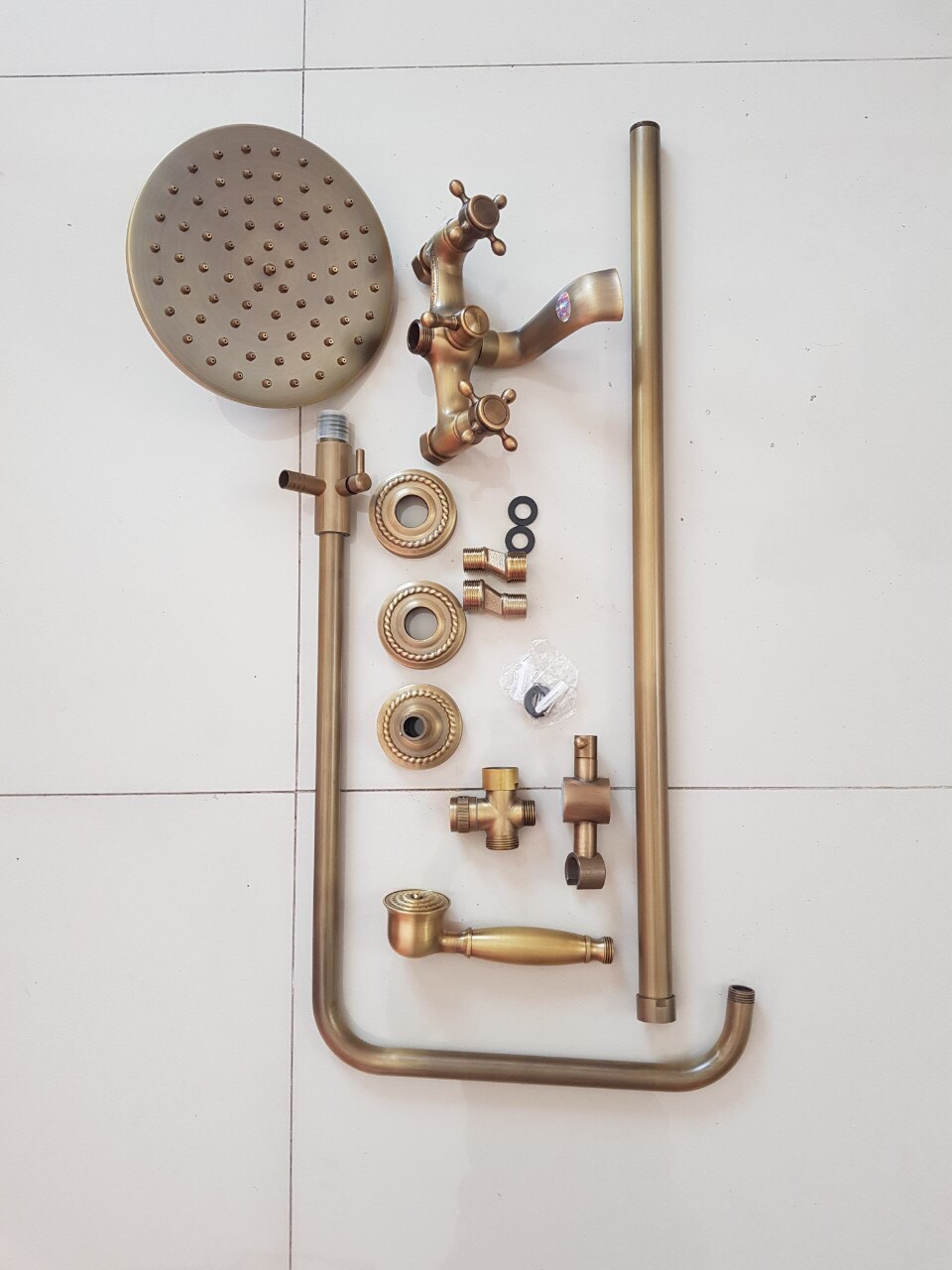 Combo gồm: 01 thân vòi sen lạnh, 01 chụp chân sen, 01 thân vòi lavabo, 01 dây cấp nước, 01 tay sen, 01 dây sen, 01 gác tay sen + ốc vít và tắc kê