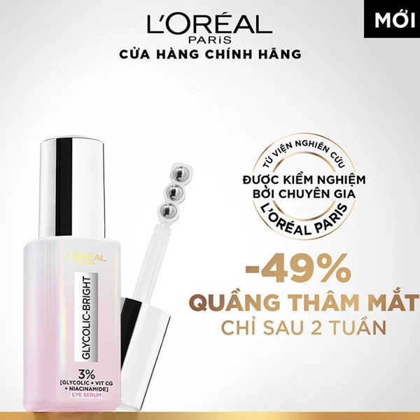 Serum L'Oreal Glycolic Dưỡng Sáng Và Mờ Thâm Vùng Mắt 20ml Serum L'Oreal Glycolic - Bright Dark Circle Eye Serum Dưỡng Sáng Và Mờ Thâm Vùng Mắt 20ml Mô tả sản phẩmQuầng thâm, da chùng nhão, kém...