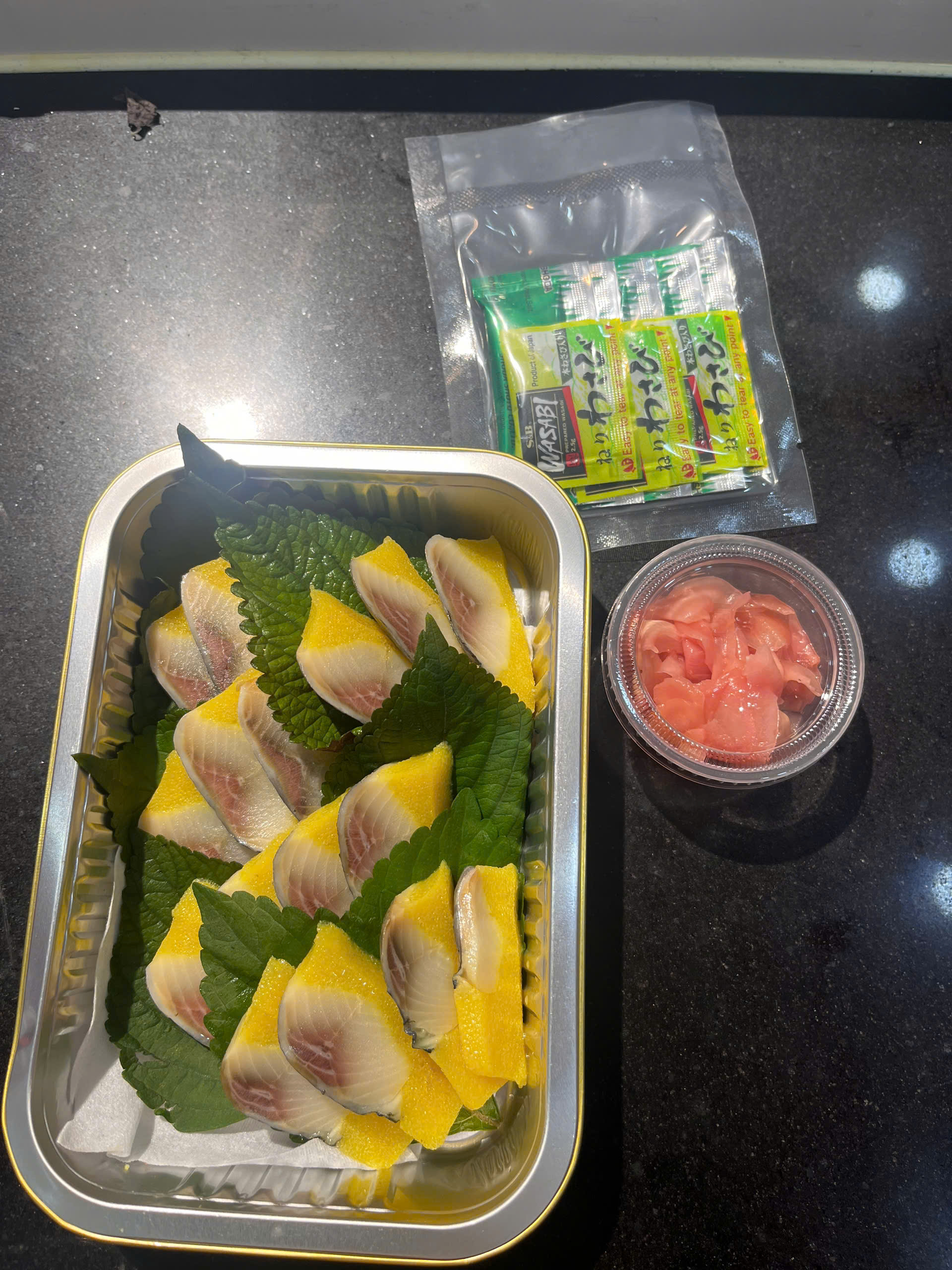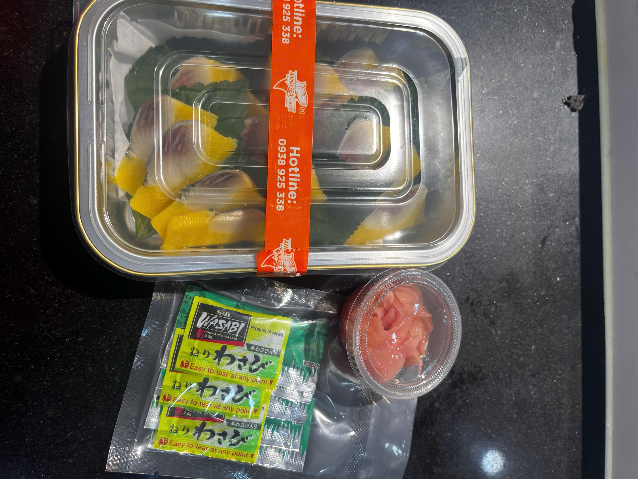 Set bao gồm: 160gram cá trứng ép trứng cắt sashimi, gia vị ăn kèm nước tương, wasabi, gừng hồng.