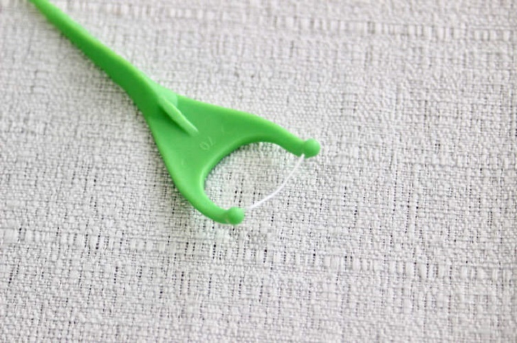 Dùng đầu có gắn chỉ luồn vào các kẽ răng, nhẹ nhàng nhấc tăm lên để lấy hết các vụn thức ăn và mảng bám.