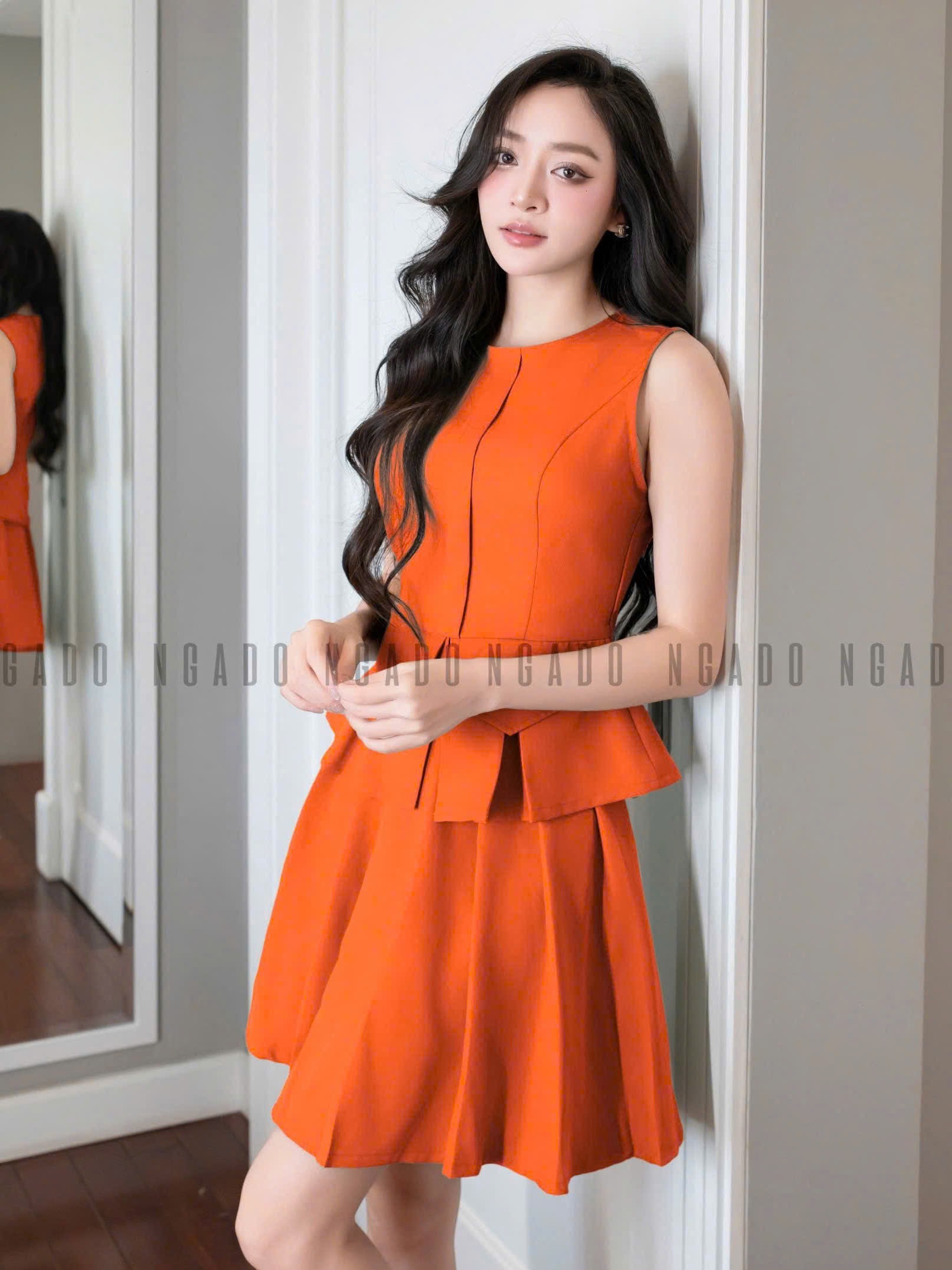 ✨Set áo váy cam xếp ly NGADO , set áo váy ngắn , set áo váy nữ , set công sở