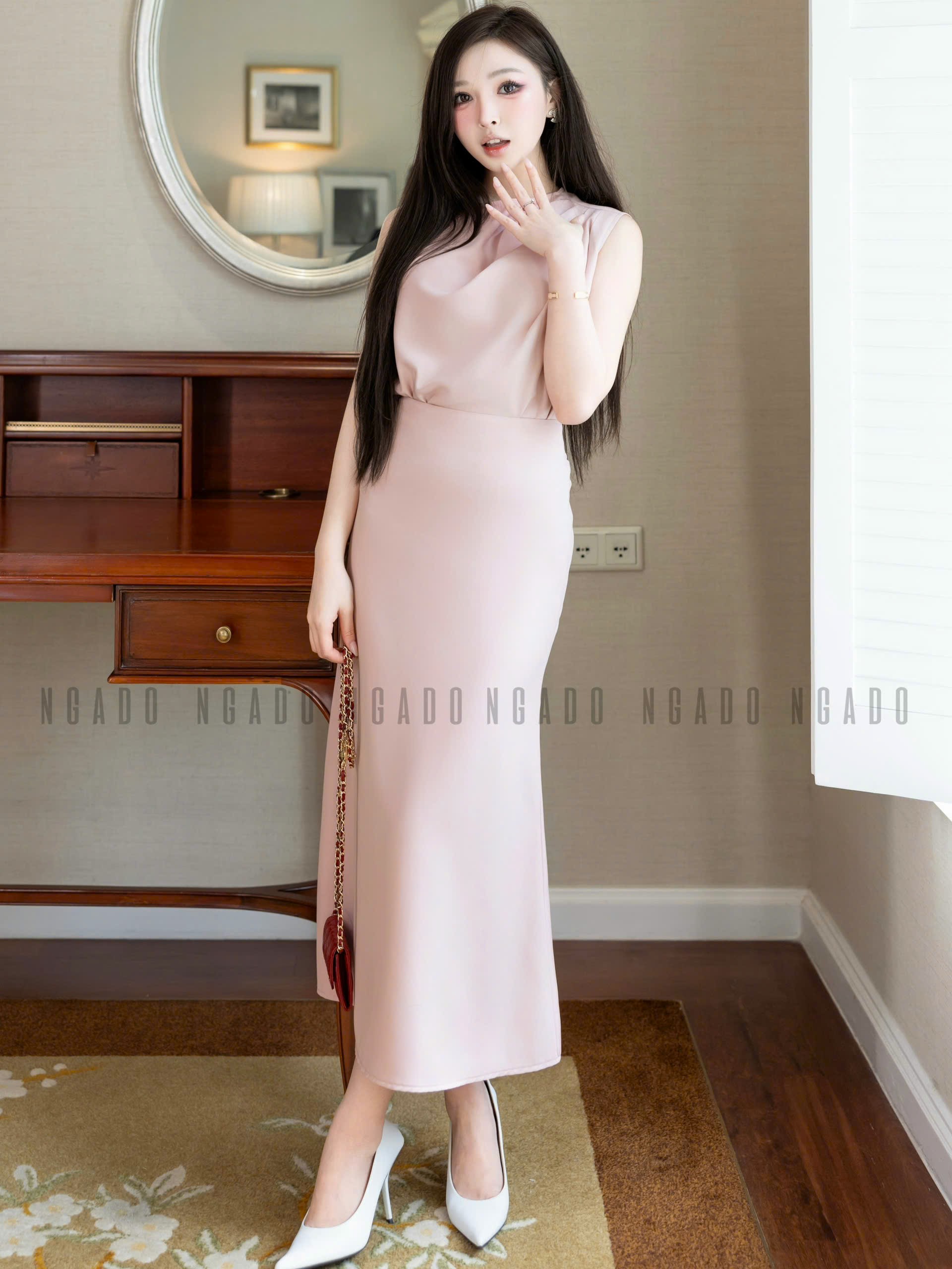 ✨Set áo váy hồng sát nách xếp ly NGADO , set áo váy dài , set áo váy hồng