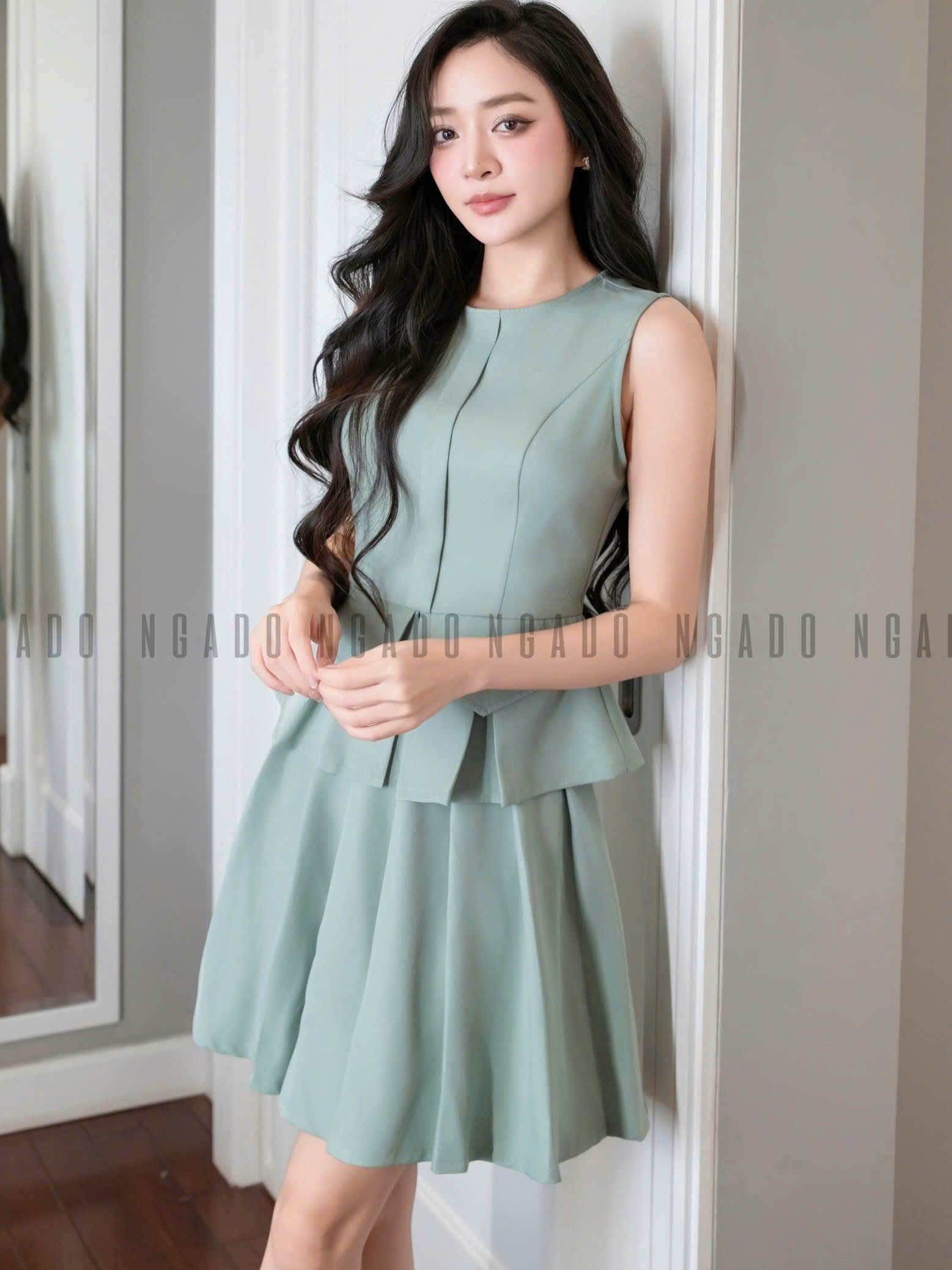 ✨Set áo váy xanh mint xếp ly NGADO , set áo váy ngắn , set áo váy nữ , set công sở
