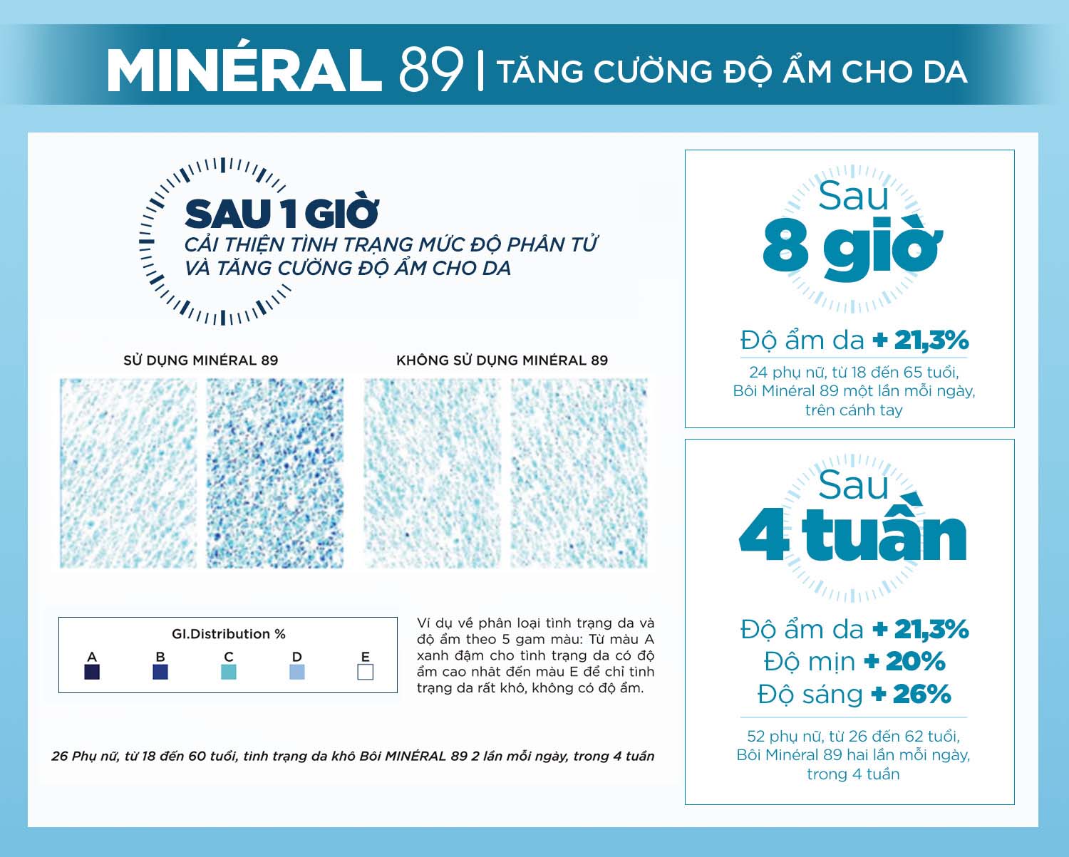 Cung cấp độ ẩm dài lâu vào sâu trong tế bào da, chứ không phải chỉ tức thời như xịt khoáng. Dưỡng chất khoáng cô đặc Vichy Mineral 89 làm dịu da, giúp da tươi trẻ mịn màng.