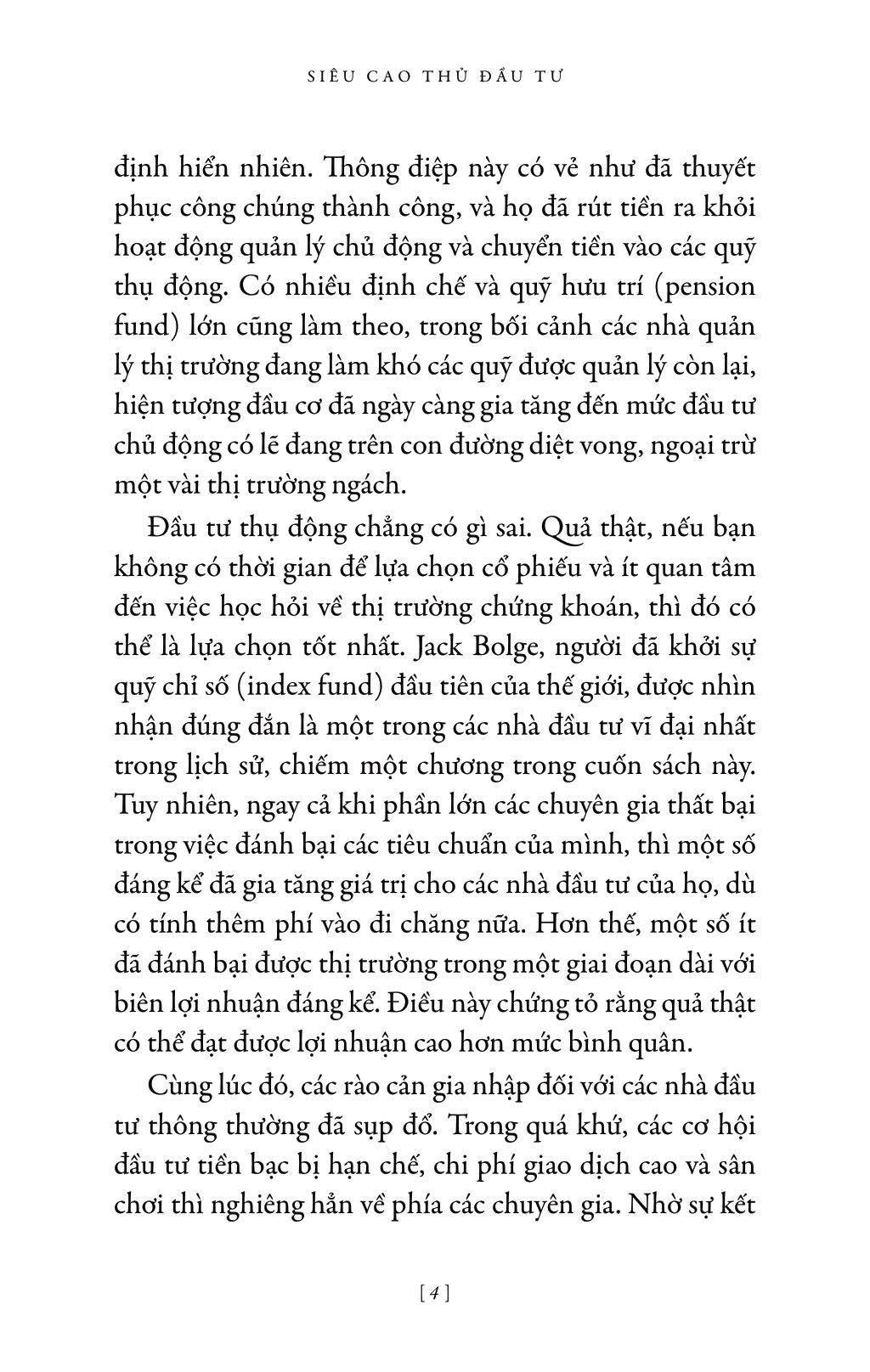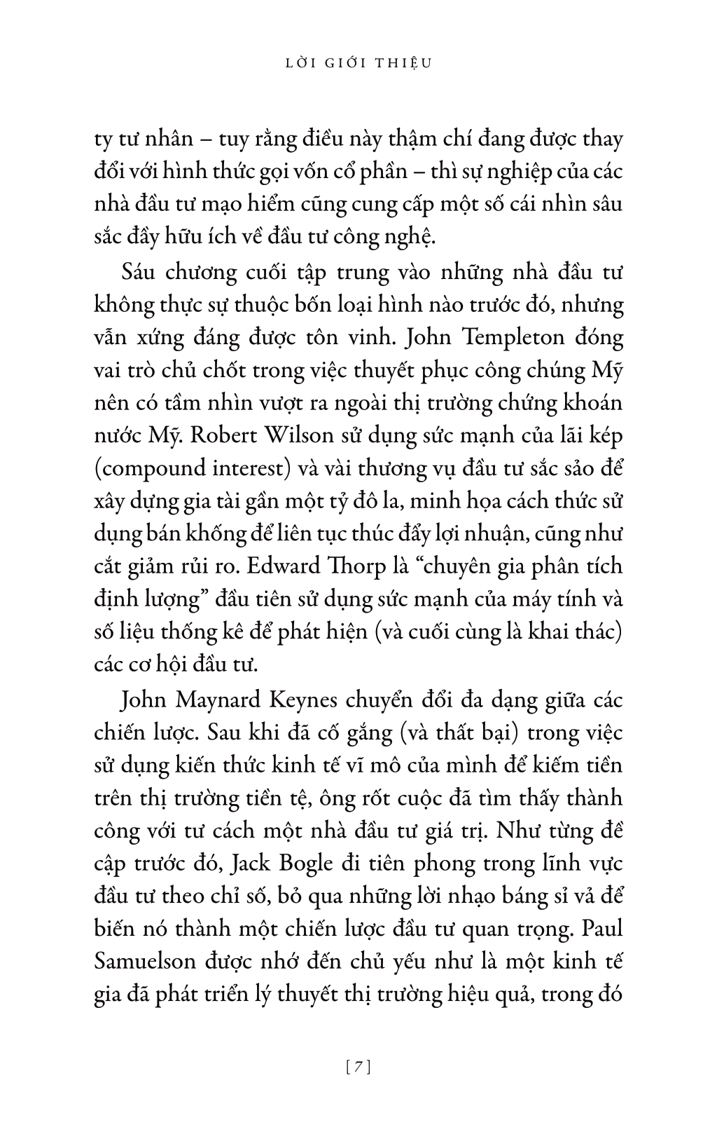 Những nhà đầu tư này đã được chọn theo nhiều tiêu chí, bao gồm khả năng đầu tư xuất sắc của họ, cách kiếm tiền, và trên hết là những gì họ có thể dạy cho các nhà đầu tư cá nhân. Các nhà đầu tư siêu hạng thuộc nhiều phong cách đầu tư khác nhau, từ David Ricardo, người kiếm được nhiều tiền nhờ dự đoán chính xác kết quả của trận Waterloo, đến cách tiếp cận theo định hướng giá trị đầy kiên nhẫn của Warren Buffett. Cuốn sách cũng xem xét một số nhà đổi mới, bao gồm việc John Bogle phát triển quỹ chỉ số như một cách tiếp cận thị trường với chi phí thấp và cách tiếp cận theo hướng dữ liệu của David Harding nhằm mục đích tránh cảm xúc của con người.